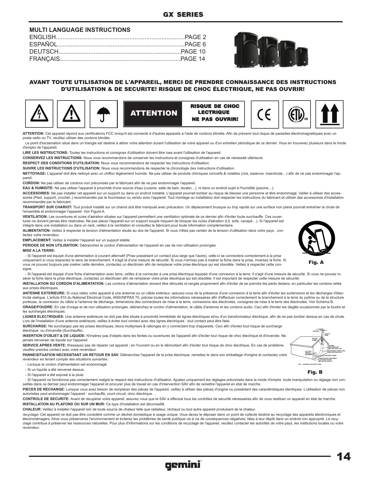 Professional ABS Moulded Loudspeakers Professionelle ABS Geformter Lautsprecher Cajas Acústicas ABS Profesionales Haut-Parleur Moulé Par ABS Professionnel GX SERIES LAUTSPRECHERSTATIVE ATTENTION: Cet appareil répond aux certifications FCC lorsqu'il est connecté à d'autres appareils à l'aide de cordons blindés. Afin de prévenir tout risque de parasites électromagnétiques avec un poste radio ou TV, veuillez utiliser des cordons blindés. Le point d'exclamation situé dans un triangle est destiné à attirer votre attention durant l'utilisation de votre appareil ou d'un entretien périodique de ce dernier. Vous en trouverez plusieurs dans le mode d'emploi de l'appareil. LIRE LES INSTRUCTIONS: Toutes les instructions et consignes d'utilisation doivent être lues avant l'utilisation de l'appareil. CONSERVEZ LES INSTRUCTIONS: Nous vous recommandons de conserver les instructions et consignes d'utilisation en cas de nécessité ultérieure. RESPECT DES CONDITIONS D'UTILISATION: Nous vous recommandons de respecter les instructions d'utilisation. SUIVRE LES INSTRUCTIONS D'UTILISATION: Nous vous recommandons de respecter la chronologie des instructions d'utilisation. NETTOYAGE: L'appareil doit être nettoyé avec un chiffon légèrement humide. Ne pas utiliser de produits chimiques corrosifs & volatiles (cire, essence, insecticide…) afin de ne pas endommager l'appareil. CORDON: Ne pas utiliser de cordons non préconisés par le fabricant afin de ne pas endommager l'appareil. EAU & HUMIDITE: Ne pas utiliser l'appareil à proximité d'une source d'eau (cuisine, salle de bain, lavabo…), ni dans un endroit sujet à l'humidité (piscine…). ACCESSOIRES: Ne pas installer cet appareil sur un support ou dans un endroit instable. L'appareil pourrait tomber au risque de blesser une personne et être endommagé. Veiller à utiliser des accessoires (Pied, support, crochet..) recommandés par le fournisseur ou vendu avec l'appareil. Tout montage ou installation doit respecter les instructions du fabricant et utiliser des accessoires d'installation recommandés par le fabricant. TRANSPORT SUR CHARIOT: Tout produit installé sur un chariot doit être manipulé avec précaution. Un déplacement brusque ou trop rapide sur une surface non plane pourrait entraîner la chute de l'ensemble et endommager l'appareil. Voir Figure A. VENTILATION: Les ouvertures et ouïes d'aération situées sur l'appareil permettent une ventilation optimale de ce dernier afin d'éviter toute surchauffe. Ces ouvertures ne doivent jamais être obstruées. Ne pas placer l'appareil sur un support souple risquant de bloquer les ouïes d'aération (Lit, sofa, canapé…). Si l'appareil est intégré dans une installation ou dans un rack, veillez à la ventilation et consultez le fabricant pour toute information complémentaire. ALIMENTATION: Veillez à respecter la tension d'alimentation située au dos de l'appareil. Si vous n'êtes pas certain de la tension d'utilisation dans votre pays, contactez votre revendeur. EMPLACEMENT: Veillez à installer l'appareil sur un support stable. PERIODE DE NON UTILISATION: Débranchez le cordon d'alimentation de l'appareil en cas de non utilisation prolongée. MISE A LA TERRE: - Si l'appareil est équipé d'une alimentation à courant alternatif (Prise possédant un contact plus large que l'autre), celle-ci se connectera correctement à la prise uniquement si vous respectez le sens de branchement. Il s'agit là d'une mesure de sécurité. Si vous n'arrivez pas à insérer la fiche dans la prise, inversez la fiche. Si Fig. A vous ne pouvez toujours pas insérer cette dernière, contactez un électricien afin de remplacer votre prise électrique qui est obsolète. Veillez à respecter cette consigne. - Si l'appareil est équipé d'une fiche d'alimentation avec terre, veillez à la connecter à une prise électrique équipée d'une connexion à la terre. Il s'agit d'une mesure de sécurité. Si vous ne pouvez insérer la fiche dans la prise électrique, contactez un électricien afin de remplacer votre prise électrique qui est obsolète. Il est important de respecter cette mesure de sécurité. INSTALLATION DU CORDON D'ALIMENTATION: Les cordons d'alimentation doivent être déroulés et rangés proprement afin d'éviter de se prendre les pieds dedans, en particulier les cordons reliés aux prises électriques. ANTENNE EXTERIEURE: Si vous reliez votre appareil à une antenne ou un câble extérieur, assurez-vous de la présence d'une connexion à la terre afin d'éviter les surtensions et les décharges d'électricité statique. L'article 810 du National Electrical Code, ANSI/NFPAS 70, précise toutes les informations nécessaires afin d'effectuer correctement le branchement à la terre du pylône ou de la structure porteuse, la connexion du câble à l'antenne de décharge, dimensions des connecteurs de mise à la terre, connexions des électrodes, consignes de mise à la terre des électrodes. Voir Schéma B. ORAGE/FOUDRE: En cas d'orage et de non utilisation prolongée, débranchez le cordon d'alimentation, le câble d'antenne et les cordons audio. Ceci afin d'éviter les dégâts occasionnés par la foudre et les surcharges électriques. LIGNES ELECTRIQUES: Une antenne extérieure ne doit pas être située à proximité immédiate de lignes électriques et/ou d'un transformateur électrique, afin de ne pas tomber dessus en cas de chute. Lors de l'installation d'une antenne extérieure, veillez à éviter tout contact avec des lignes électriques : tout contact peut être fatal. SURCHARGE: Ne surchargez pas les prises électriques, blocs multiprises & rallonges en y connectant trop d'appareils. Ceci afin d'éviter tout risque de surcharge électrique ou d'incendie (Surchauffe). INSERTION D'OBJET & DE LIQUIDE: N'insérez pas d'objets dans les fentes ou ouvertures de l'appareil afin d'éviter tout risque de choc électrique et d'incendie. Ne jamais renverser de liquide sur l'appareil. SERVICE AP