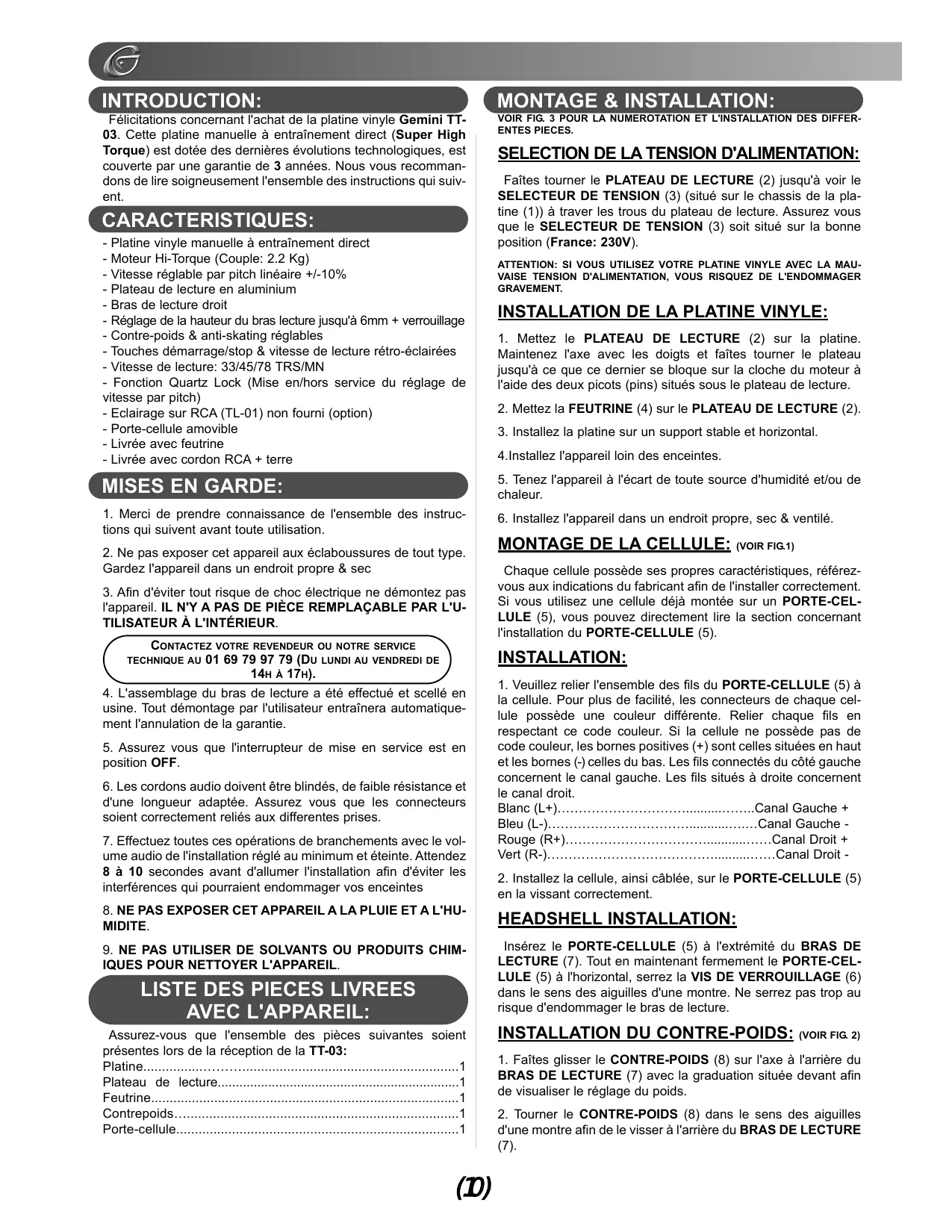 Alimentación.................................AC 115 V~60 Hz/230 V~50 Hz Consumo.............................................................................30 W Dimensiones.................................................17.75" x 5.75" x 14" ...................................................................(450 x 136 x 352 mm) Peso..................................................................20.1 lbs. (9.1 kg) (9) ESPECIFICACIONES SUJETAS A VARIACIÓN SIN PREVIO AVISO. INTRODUCTION: MONTAGE & INSTALLATION: Félicitations concernant l'achat de la platine vinyle Gemini TT03. Cette platine manuelle à entraînement direct (Super High Torque) est dotée des dernières évolutions technologiques, est couverte par une garantie de 3 années. Nous vous recommandons de lire soigneusement l'ensemble des instructions qui suivent. VOIR FIG. 3 POUR LA NUMEROTATION ET L'INSTALLATION DES DIFFERENTES PIECES. CARACTERISTIQUES: - Platine vinyle manuelle à entraînement direct - Moteur Hi-Torque (Couple: 2.2 Kg) - Vitesse réglable par pitch linéaire +/-10% - Plateau de lecture en aluminium - Bras de lecture droit - Réglage de la hauteur du bras lecture jusqu'à 6mm + verrouillage - Contre-poids & anti-skating réglables - Touches démarrage/stop & vitesse de lecture rétro-éclairées - Vitesse de lecture: 33/45/78 TRS/MN - Fonction Quartz Lock (Mise en/hors service du réglage de vitesse par pitch) - Eclairage sur RCA (TL-01) non fourni (option) - Porte-cellule amovible - Livrée avec feutrine - Livrée avec cordon RCA + terre SELECTION DE LA TENSION D'ALIMENTATION: Faîtes tourner le PLATEAU DE LECTURE (2) jusqu'à voir le SELECTEUR DE TENSION (3) (situé sur le chassis de la platine (1)) à traver les trous du plateau de lecture. Assurez vous que le SELECTEUR DE TENSION (3) soit situé sur la bonne position (France: 230V). ATTENTION: SI VOUS UTILISEZ VOTRE PLATINE VINYLE AVEC LA MAUVAISE TENSION D'ALIMENTATION, VOUS RISQUEZ DE L'ENDOMMAGER GRAVEMENT. INSTALLATION DE LA PLATINE VINYLE: