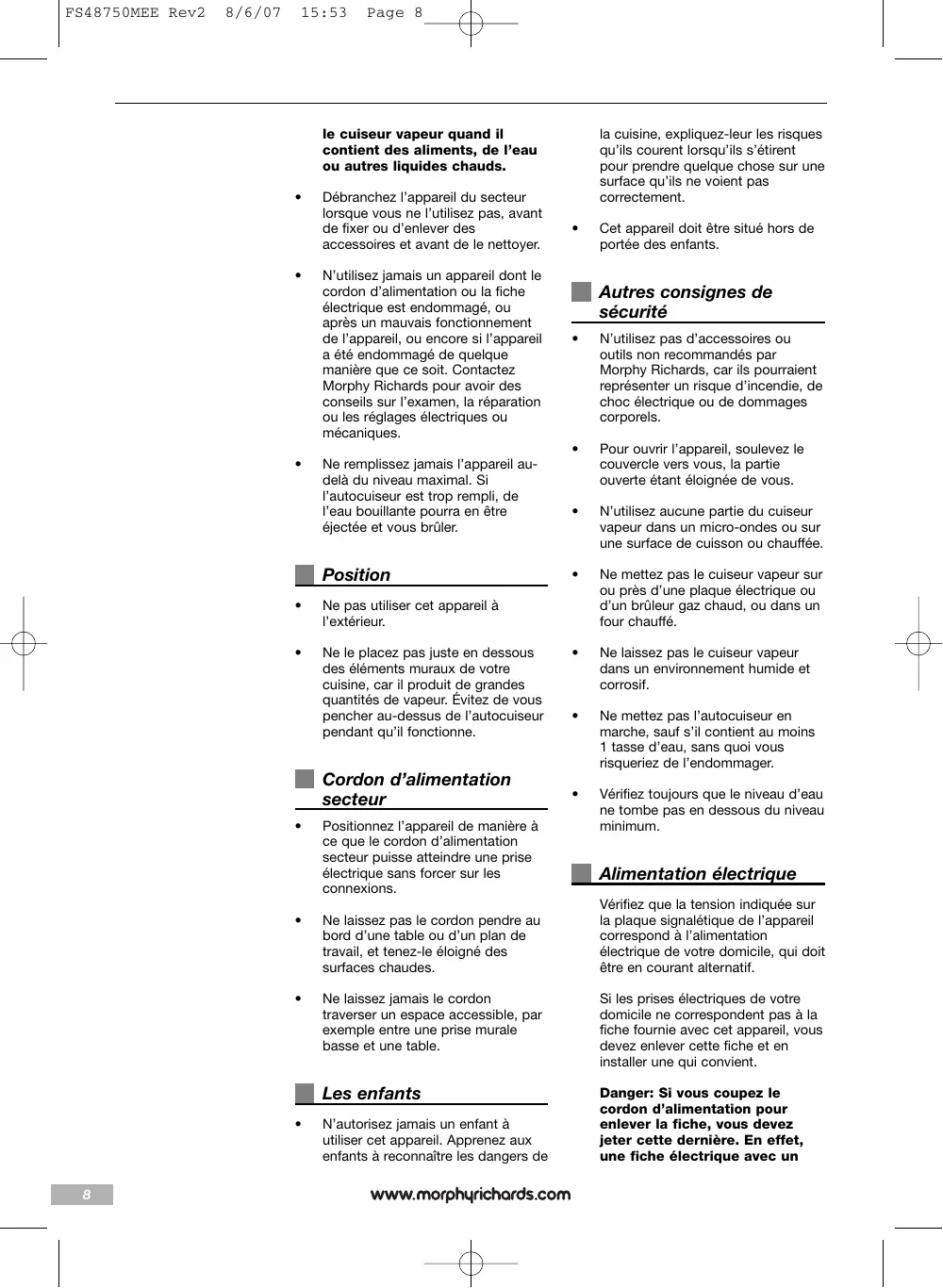 Débranchez l’appareil du secteur lorsque vous ne l’utilisez pas, avant de fixer ou d’enlever des accessoires et avant de le nettoyer. N’utilisez jamais un appareil dont le cordon d’alimentation ou la fiche électrique est endommagé, ou après un mauvais fonctionnement de l’appareil, ou encore si l’appareil a été endommagé de quelque manière que ce soit. Contactez Morphy Richards pour avoir des conseils sur l’examen, la réparation ou les réglages électriques ou mécaniques. Ne remplissez jamais l’appareil audelà du niveau maximal. Si l’autocuiseur est trop rempli, de l’eau bouillante pourra en être éjectée et vous brûler.