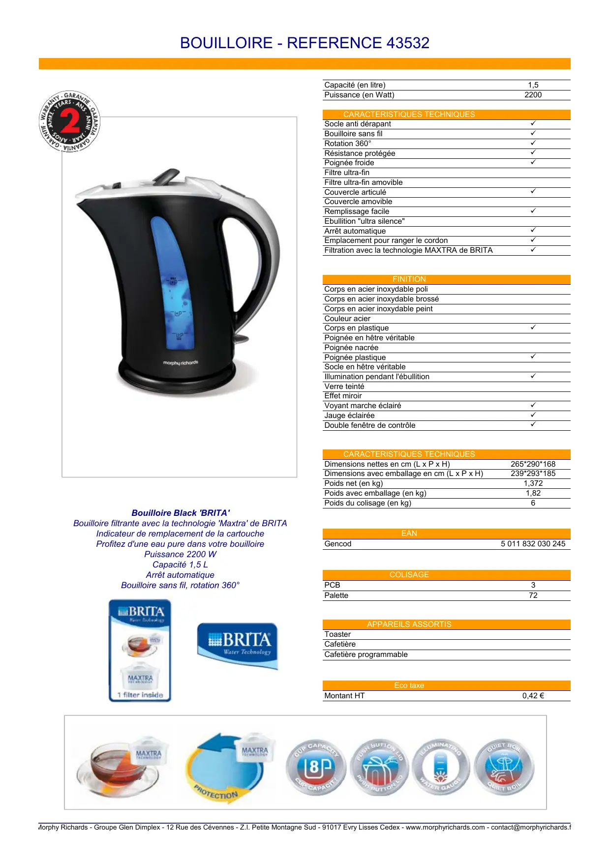 Retrouvez gratuitement la notice de l'appareil BOUILLOIRE 43532 MORPHY RICHARDS au format PDF.