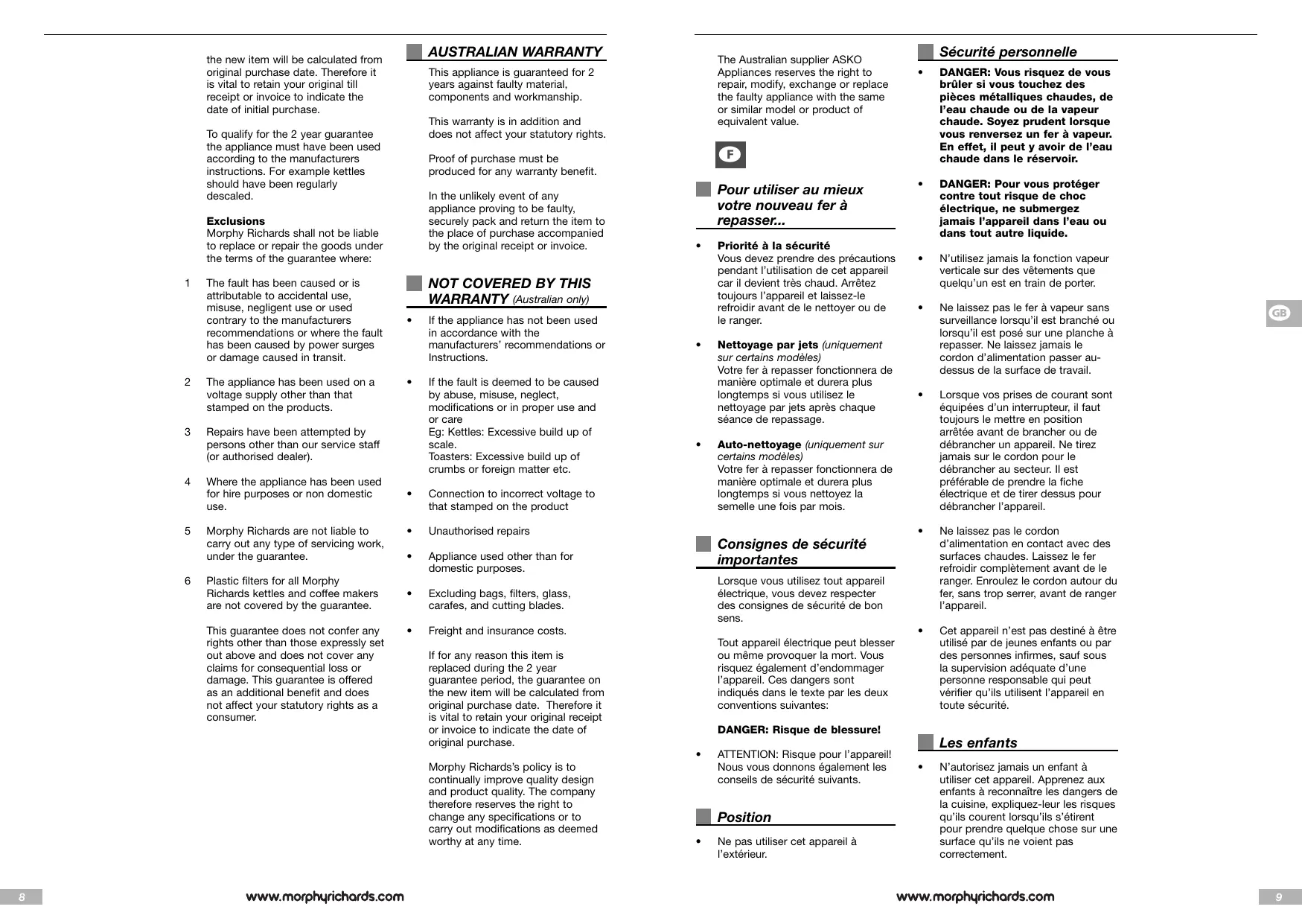 f Les produits Morphy Richards sont conçus pour unusage exclusivement domestique. Morphy Richards s’engage à mener une politique d’amélioration continue en termes de qualité et de conception. Le fabricant se réserve donc le droit de modifier sans préavis la spécification de ses modèles.