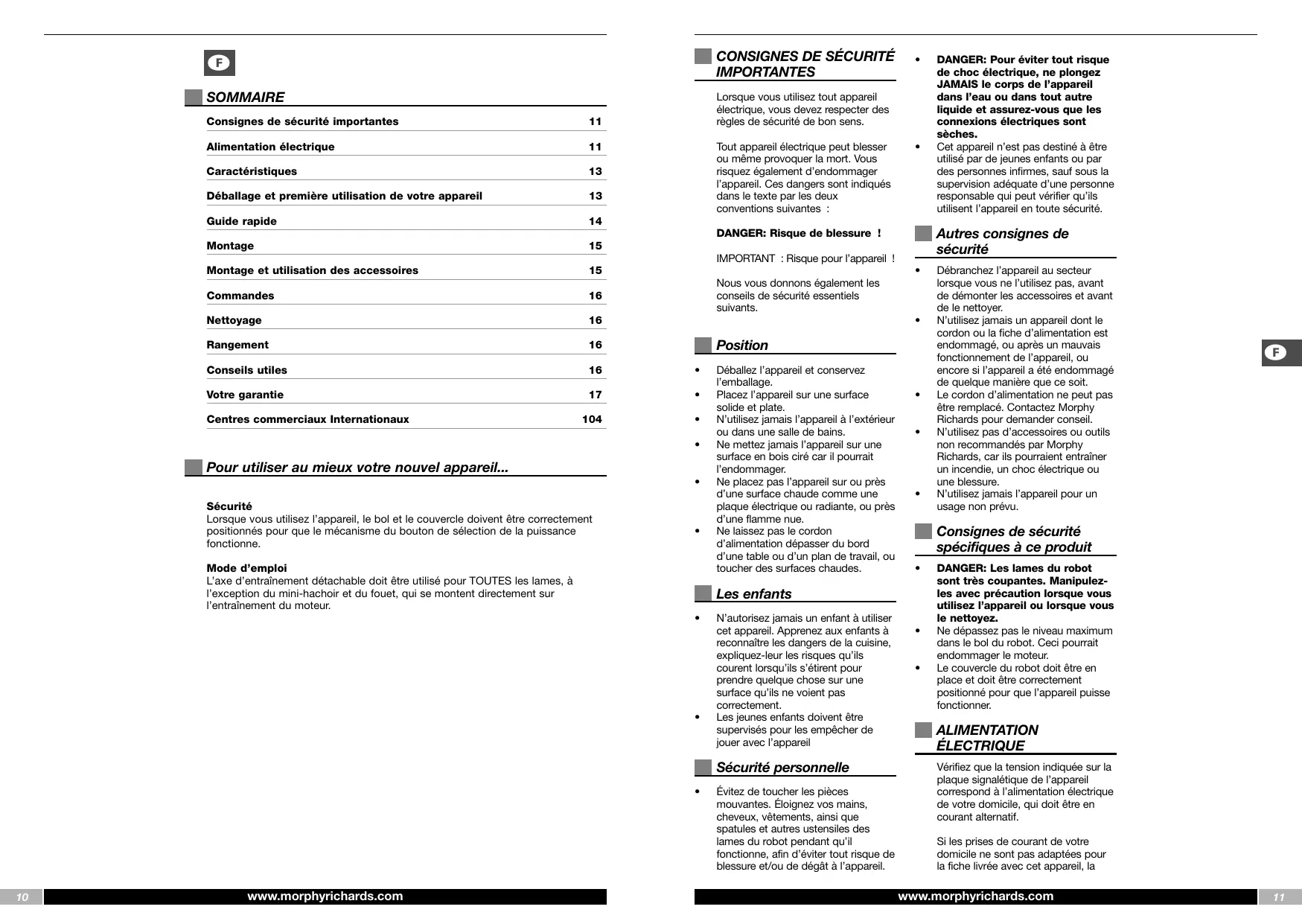 N’utilisez jamais un appareil dont le cordon ou la fiche d’alimentation est endommagé, ou après un mauvais fonctionnement de l’appareil, ou encore si l’appareil a été endommagé de quelque manière que ce soit. Le cordon d’alimentation ne peut pas être remplacé. Contactez Morphy Richards pour demander conseil. N’utilisez pas d’accessoires ou outils non recommandés par Morphy Richards, car ils pourraient entraîner un incendie, un choc électrique ou une blessure. N’utilisez jamais l’appareil pour un usage non prévu.