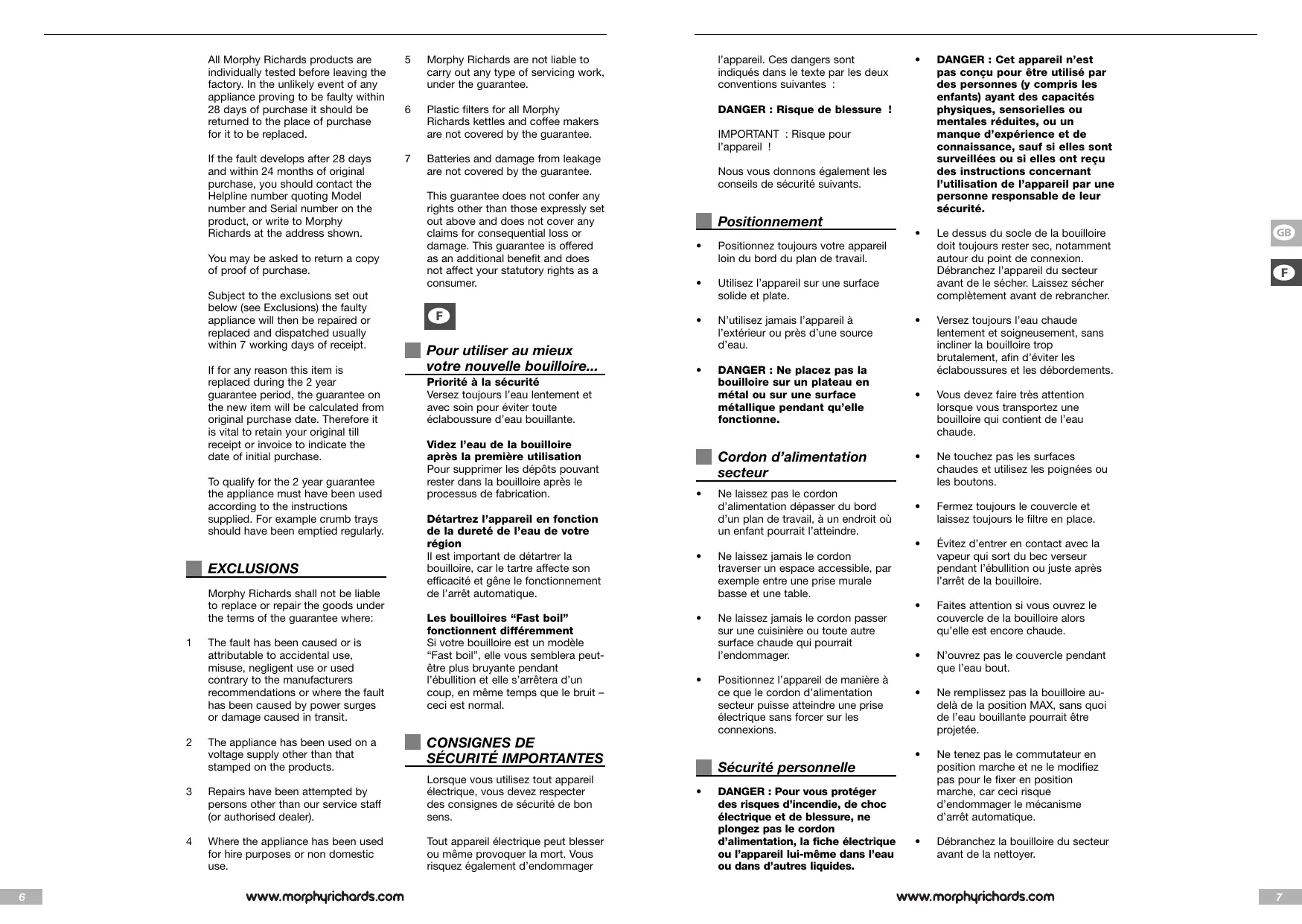 Morphy Richards, car ils pourraient entraîner un incendie, un choc électrique ou une blessure. Ne tentez pas de mettre un autre appareil sur le socle ou de mettre la bouilloire sur un autre socle.