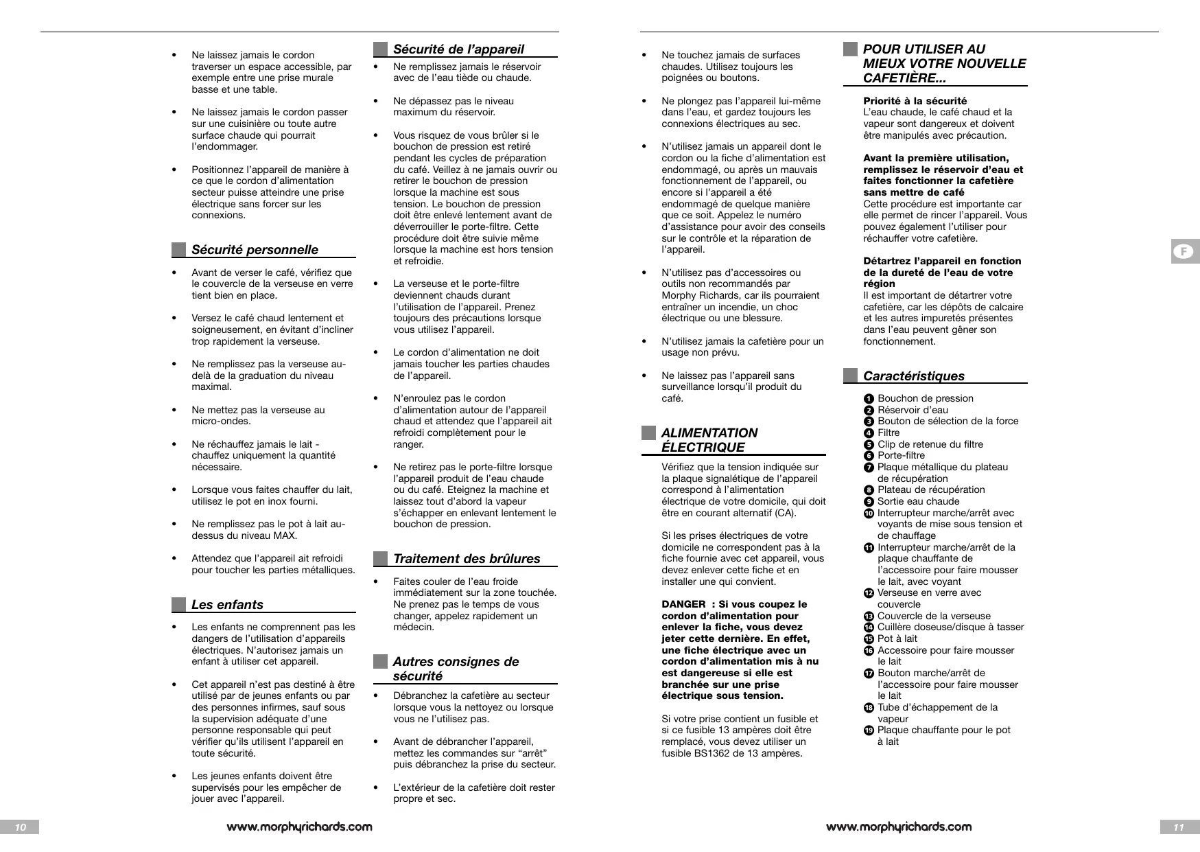 Morphy Richards n’est pas dans l’obligation de réaliser des travaux d’entretien, quels qu’ils soient, aux termes de la garantie. La garantie exclut les consommables tels que les sacs, les filtres et les carafes en verre. Cette garantie ne confère aucun droit à l’exception de ceux qui sont expressément indiqués ci-dessus, et ne couvre aucune réclamation pour dommages immatériels ou indirects. Cette garantie est offerte comme avantage supplémentaire et n’a aucune incidence sur vos droits légaux en tant que consommateur. Pour la clientèle en Belgique Les produits de Morphy Richards sont produits conformément les normes de qualité, agrée international. Au-dessus vos droits légaux, Morphy Richards vous garantit qu’à partir d’achat ce produit sera sans défauts de fabrication ou de matériels pendant une période de deux ans. Si, pour quelque raison que ce soit, l’article est remplacé pendant la période de garantie (deux ans), la période de garantie du nouvel article sera calculée à partir de la date d’achat d’origine. Il est donc très importants de conserver votre bon d’achat original afin de connaître la date initiale d’achat. WICHTIGE SICHERHEITSHINWEISE Cette garantie vaut uniquement quand l’appareil a été utilisé conformément aux instructions du fabricant. Par exemple, les appareils doivent être détartrés et les filtres doivent être tenus propre selon le mode d’emploi. Si le problème, prévient d’une utilisation accidentelle, d’une utilisation abusive ou négligente, ou si l’appareil a été utilisé de manière contraire aux recommandations du fabricant, ou encore lorsque le problème provient de source de puissance ou de dégâts occasionnés en transit.