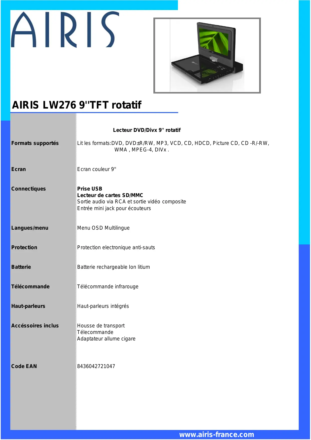 LW276 - Lecteur DVD portable AIRIS - Notice d'utilisation et mode d'emploi gratuit