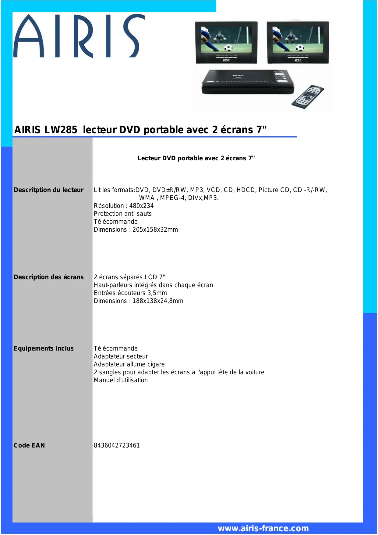 AIRIS AIRIS LW285 lecteur DVD portable avec 2 écrans 7" Lecteur DVD portable avec 2 écrans 7" Descritption du lecteur … Lit les formats:DVD, DVD#R/RW, MP3, VCD, CD, HDCD, Picture CD, CD -R/-RW, WMA, MPEG-4, DIVx,MP3. Résolution : 480x234 Protection anti-sauts Télécommande Dimensions : 205x158x32mm Description des écrans 2 écrans séparés LCD 7" Haut-parleurs intégrés dans chaque écran Entrées écouteurs 3,5mm Dimensions : 188x138x24,8mm Equipements inclus Télécommande Adaptateur secteur Adaptateur allume cigare 2 sangles pour adapter les écrans à l'appui tête de la voiture Manuel d'utilisation