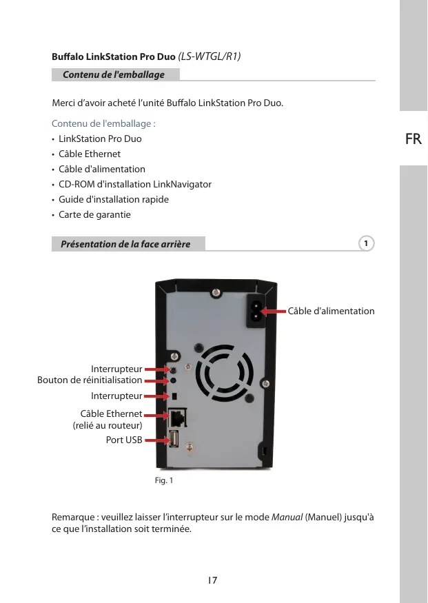 Buffalo LinkStation Pro Duo (LS-WTGL/R1) Contenu de l'emballage Merci d’avoir acheté l’unité Buffalo LinkStation Pro Duo. Contenu de l'emballage :