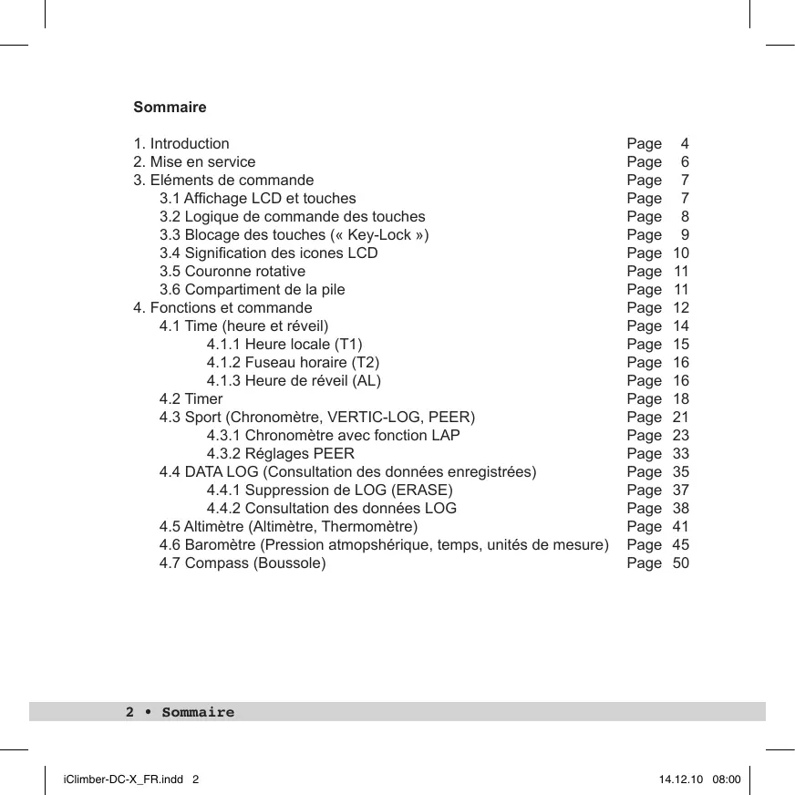 Nous vous remercions d’avoir choisi le iClimber-DCX de IROX. Vous êtes propriétaire d’une montre-bracelet de grande qualité, qui résulte de la combinaison entre un design italien, une ingénierie suisse, une technologie canadienne et suisse et une fabrication dans l’une des meilleures usines de l’agglomération de Hong Kong. Le iClimber-DCX vous offre de réelles nouveautés dans le domaine des montresbracelet. Il s’agit entre autres de la fonction VERTIC-LOG®, développée en partenariat avec des guides de montagne suisses. En plus des étapes de manipulation décrites au chapitre 4, vous trouverez au chapitre 9 une explication sur la manière d’utiliser cette fonction et la raison pour laquelle des guides de montagne nous ont recommandé cette fonction. La DC-X propose des fonctions supplémentaires qui peuvent être utilisées avec des appareils périphériques (« Peer ») via un signal 2.4 GHz : – Thermo Peer avec THERMO-LOG® – Heart Peer (ceinture pectorale avec mesure de la fréquence cardiaque) – Foot Peer (capteur de cadence pour la chaussure) – PC Peer (clé USB avec logiciel PC pour évaluation des données) Tous ces Peers sont des options et peuvent être acquis en supplément. Le Thermo Peer avec la fonction THERMO-LOG est une innovation de IROX. Cette fonction fait de la DC-X la première montre-bracelet capable de mesurer la véritable température ambiante et à l’afficher sur la montre. Ces instructions décrivent toutes les fonctions Peer. Si vous n’utilisez pas le Peer correspondant, vous pouvez simplement passer aux paragraphes suivants. Un Peer peut être activé sans aucune restriction à un moment ultérieur. Veuillez lire attentivement ce mode d'emploi. Vous y trouverez des indications utiles et intéressantes en plus des conseils d’utilisation. 4 • Introduction iClimber-DC-X_FR.indd 4