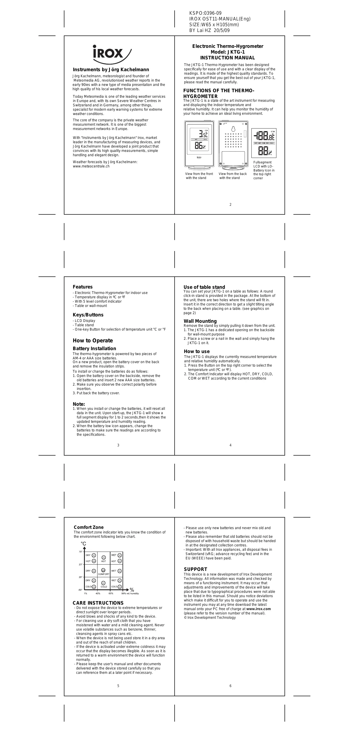 Le thermo-hygromètre Irox JKTG-1 a été conçu spécialement en vue d'un usage simple et avec un affichage clair à la lecture. Il répond au standard de qualité le plus élevé grâce à des composants électroniques de précision. Pour être sûr de profiter au maximum des possibilités de votre JKTG-1, veuillez lire le manuel suivant avec attention.