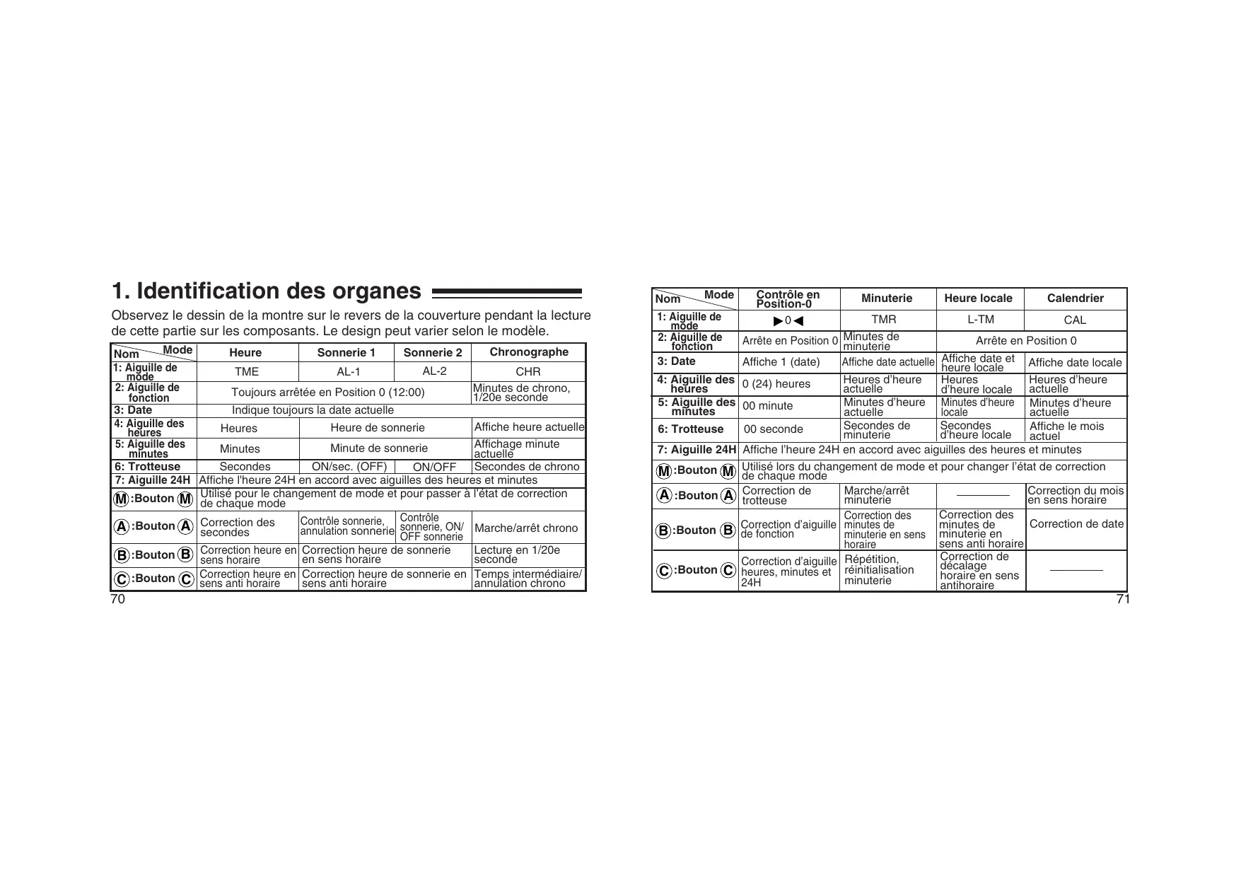 Contrôle en Mode Heure locale Minuterie Calendrier Nom Position-0 1: Aiguille de TMR L-TM CAL mode Minutes 2: Aiguille de Arrête en Position 0 Arrête en Position 0 minuterie fonction Affiche date et Affiche date locale 3: Date Affiche 1 (date) Affiche date actuelle heure locale Heures d’heure 4: Aiguille des 0 (24) heures Heures d’heure Heures heures actuelle d’heure locale actuelle 5: Aiguille des 00 minute Minutes d’heure Minutes d’heure Minutes d’heure minutes actuelle locale actuelle Secondes de Secondes Affiche le mois 6: Trotteuse 00 seconde minuterie d’heure locale actuel Affiche l’heure 24H accord avec aiguilles des heures minutes 7: Aiguille 24H Utilisé lors changement mode pour changer l’état correction M :Bouton M de chaque mode Correction du mois Marche/arrêt A :Bouton A Correction en sens horaire minuterie trotteuse Correction des Correction des Correction de date Correction d’aiguille minutes de minutes de B :Bouton B de fonction minuterie en sens minuterie en sens anti horaire horaire Correction de Correction d’aiguille Répétition, décalage C :Bouton C heures, minutes et réinitialisation horaire en sens minuterie 24H antihoraire