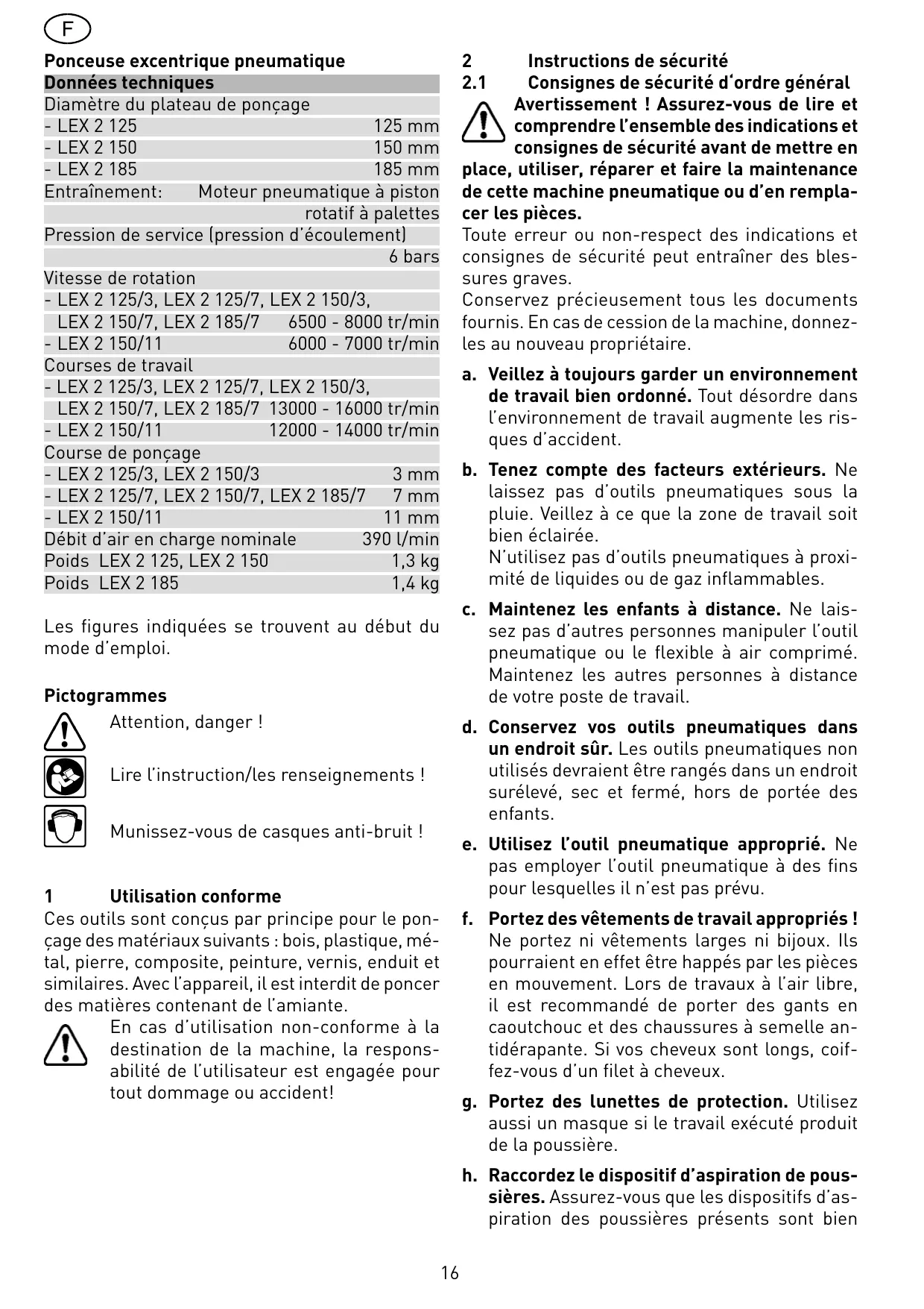 Pictogrammes Attention, danger ! f. Portez des vêtements de travail appropriés ! Ne portez ni vêtements larges ni bijoux. Ils pourraient en effet être happés par les pièces en mouvement. Lors de travaux à l’air libre, il est recommandé de porter des gants en caoutchouc et des chaussures à semelle antidérapante. Si vos cheveux sont longs, coiffez-vous d’un filet à cheveux. g. Portez des lunettes de protection. Utilisez aussi un masque si le travail exécuté produit de la poussière. h. Raccordez le dispositif d’aspiration de poussières. Assurez-vous que les dispositifs d’aspiration des poussières présents sont bien 16