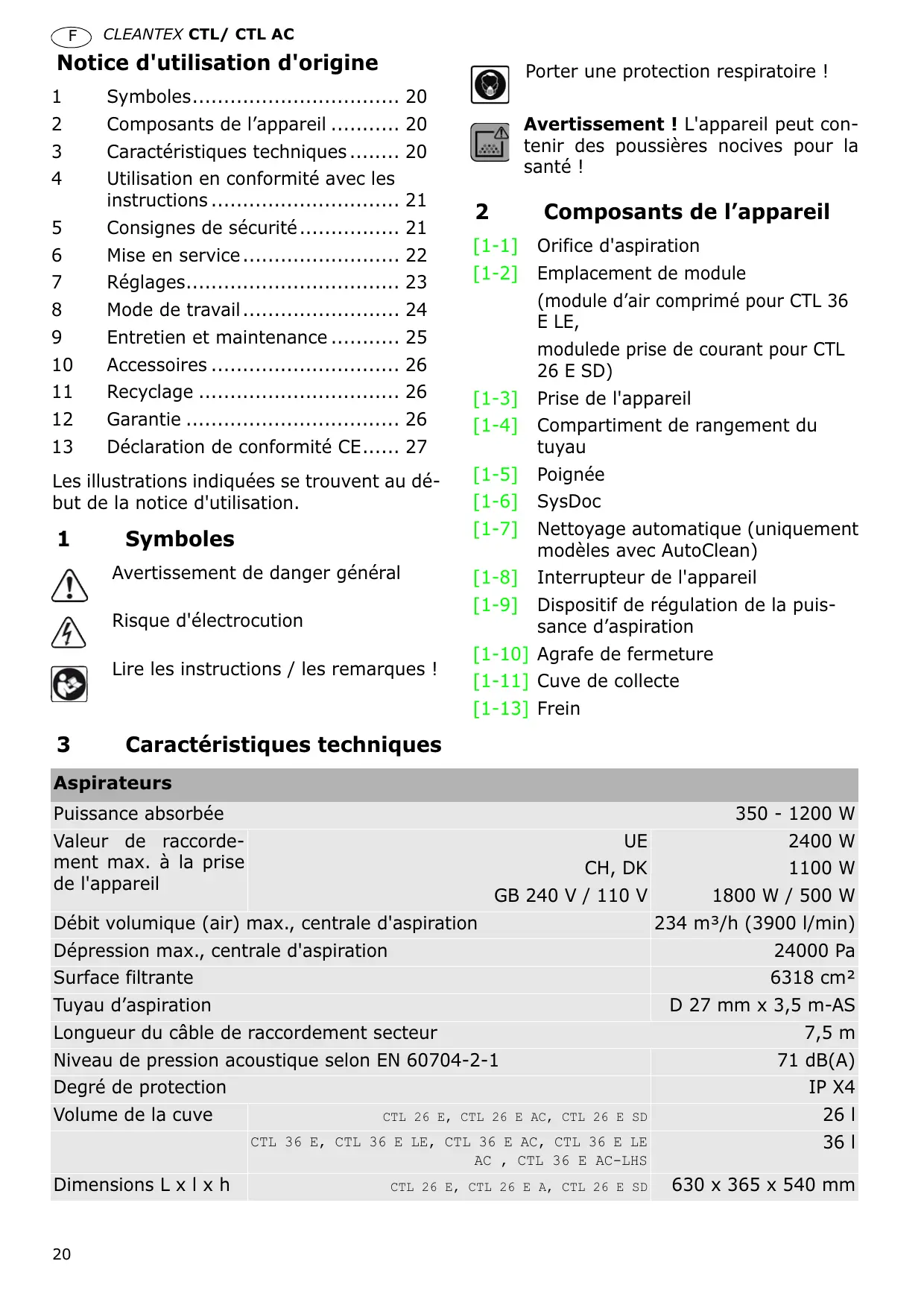 - Déclaration de conformité CE (module d’air comprimé pour CTL 36 E LE, modulede prise de courant pour CTL 26 E SD) [1-3] Prise de l'appareil [1-4] Compartiment de rangement du tuyau [1-5] Poignée [1-6] SysDoc [1-7] Nettoyage automatique (uniquement modèles avec AutoClean) [1-8] Interrupteur de l'appareil [1-9] Dispositif de régulation de la puissance d’aspiration [1-10] Agrafe de fermeture [1-11] Cuve de collecte [1-13] Frein Les illustrations indiquées se trouvent au début de la notice d'utilisation. p. 27