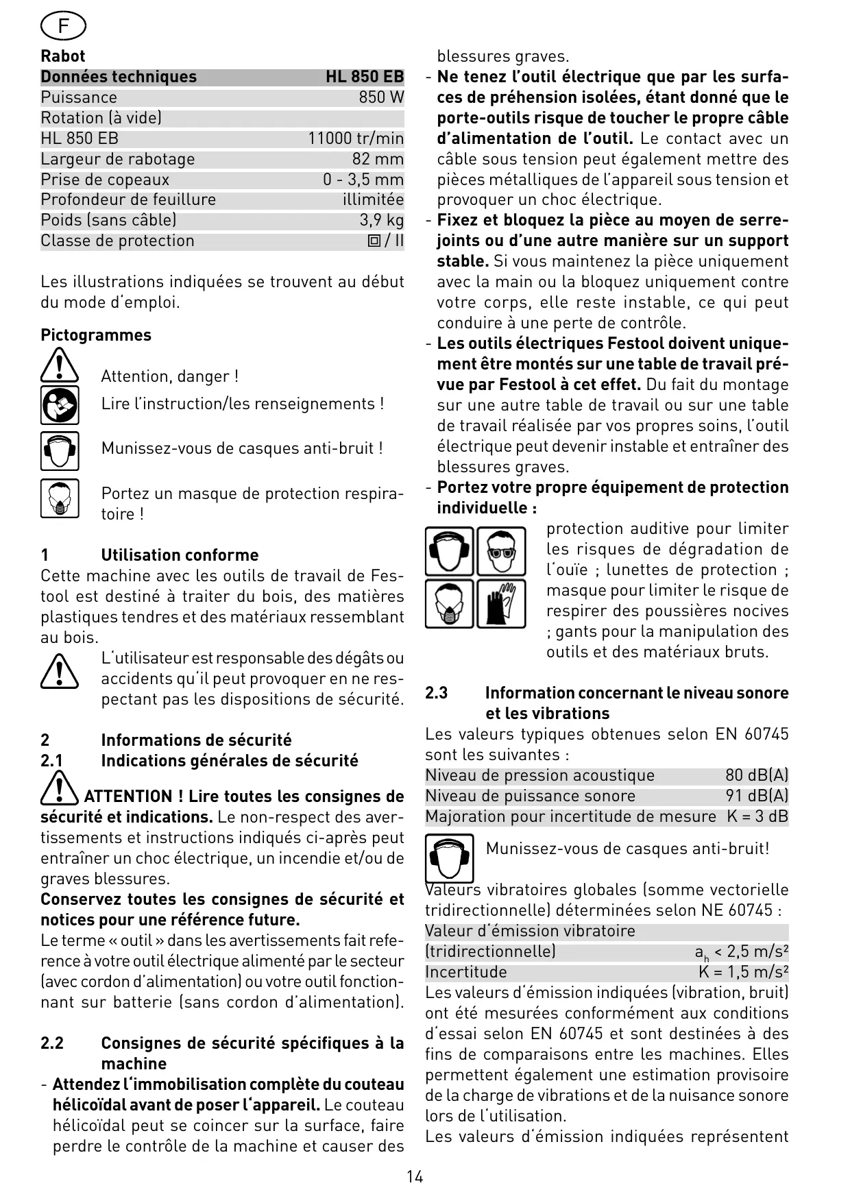 Pictogrammes Attention, danger ! Lire l’instruction/les renseignements ! Munissez-vous de casques anti-bruit ! Portez un masque de protection respiratoire ! 1 Utilisation conforme Cette machine avec les outils de travail de Festool est destiné à traiter du bois, des matières plastiques tendres et des matériaux ressemblant au bois. L‘utilisateur est responsable des dégâts ou accidents qu‘il peut provoquer en ne respectant pas les dispositions de sécurité. 2 2.1