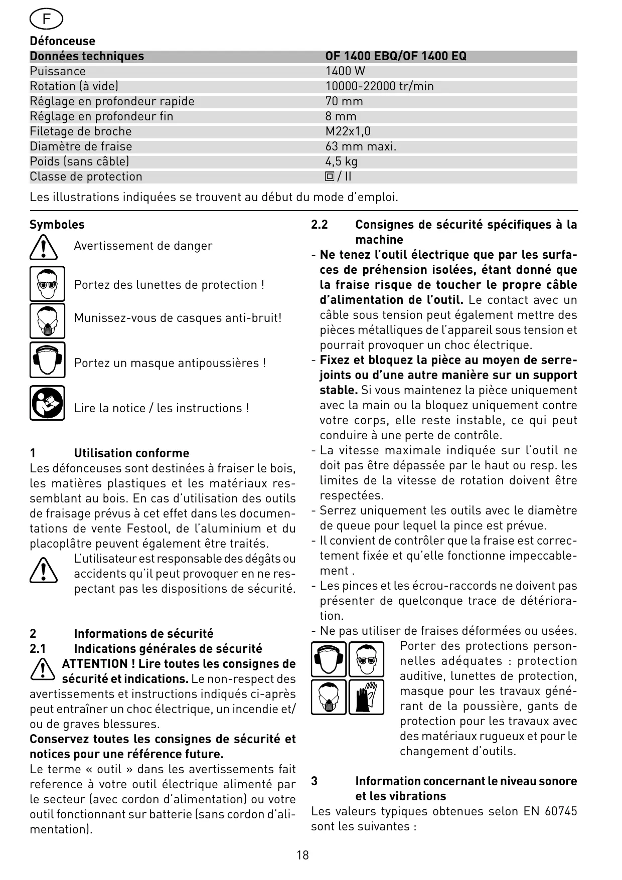 OF 1400EQ - Défonceuse FESTOOL - Notice d'utilisation et mode d'emploi gratuit