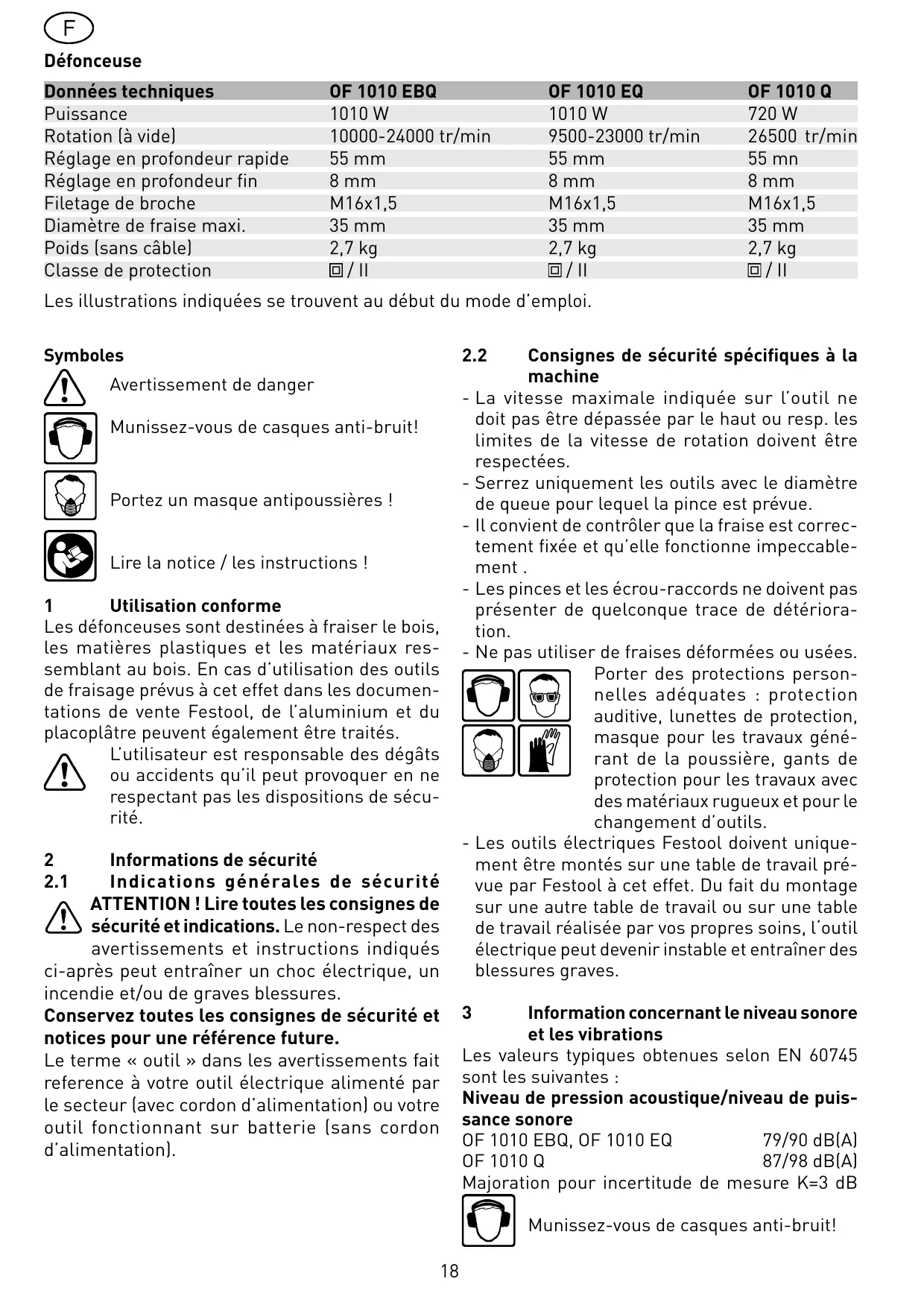 1 Utilisation conforme Les défonceuses sont destinées à fraiser Le bois, les matières plastiques et Les matériaux res- semblant au bois. En cas d'utilisation des outils de fraisage prévus à cet effet dans Les documen- tations de vente Festool, de l'aluminium et du placoplâtre peuvent également être traités. L'utilisateur est responsable des dégâts A ou accidents qu'il peut provoquer en ne respectant pas les dispositions de sécu- Munissez-vous de casques anti-bruit! Portez un masque antipoussières | Lire La notice / Les instructions ! rité. 2 Informations de sécurité
