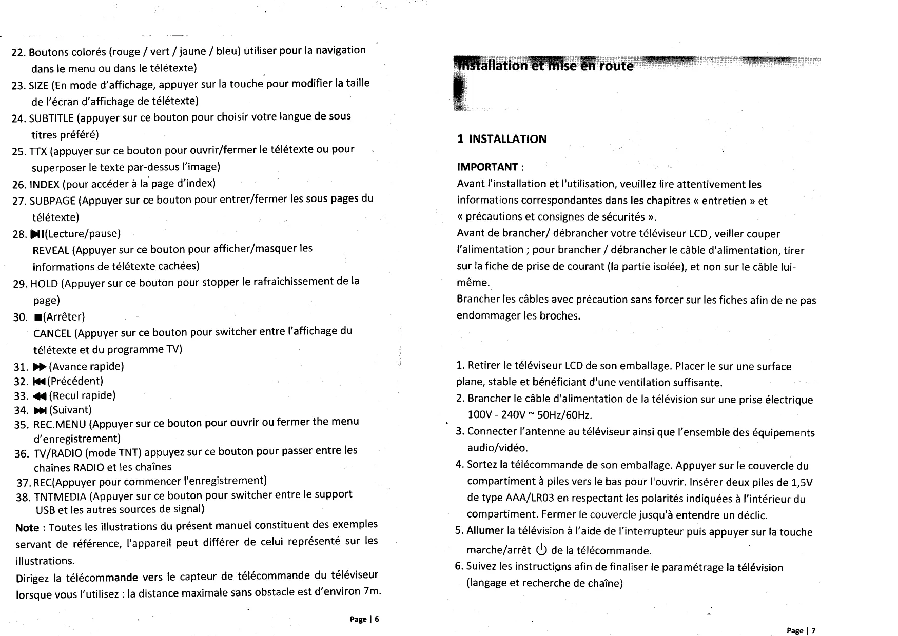 Placerle sur une surface plane,stableet b6n6ficiant d'uneventilationsuffisante. servant de r6f6rence,l'appareilpeut diff6rer de celui repr6sent6sur les i ||ustrations. Dirigezla t6l6commandevers le capteurde t6l6commandedu t6l6viseur lorsquevousl'utilisez: la distancemaximalesansobstacleest d'environ7m'