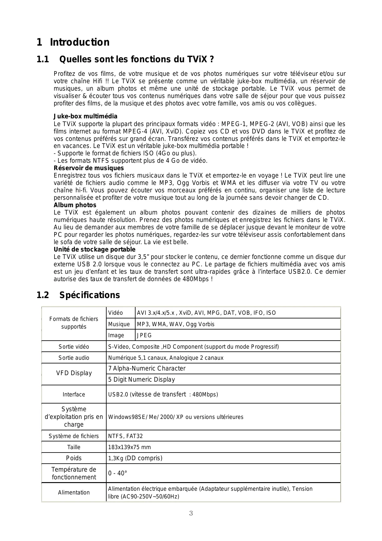 Spécifications Formats de fichiers supportés Vidéo AVI 3.x/4.x/5.x , XviD, AVI, MPG, DAT, VOB, IFO, ISO Musique MP3, WMA, WAV, Ogg Vorbis Image JPEG Sortie vidéo S-Video, Composite ,HD Component (support du mode Progressif) Sortie audio Numérique 5,1 canaux, Analogique 2 canaux VFD Display 7 Alpha-Numeric Character 5 Digit Numeric Display Interface USB2.0 (vitesse de transfert : 480Mbps) Système d’exploitation pris en Windows98SE/ Me/ 2000/ XP ou versions ultérieures charge Système de fichiers NTFS, FAT32 Taille 183x139x75 mm Poids 1,3Kg (DD compris) Température de fonctionnement Alimentation