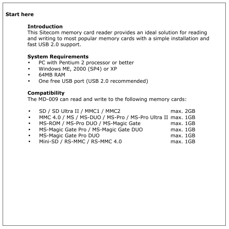 MD-009 - Lecteur de carte mémoire SITECOM - Notice d'utilisation et mode d'emploi gratuit