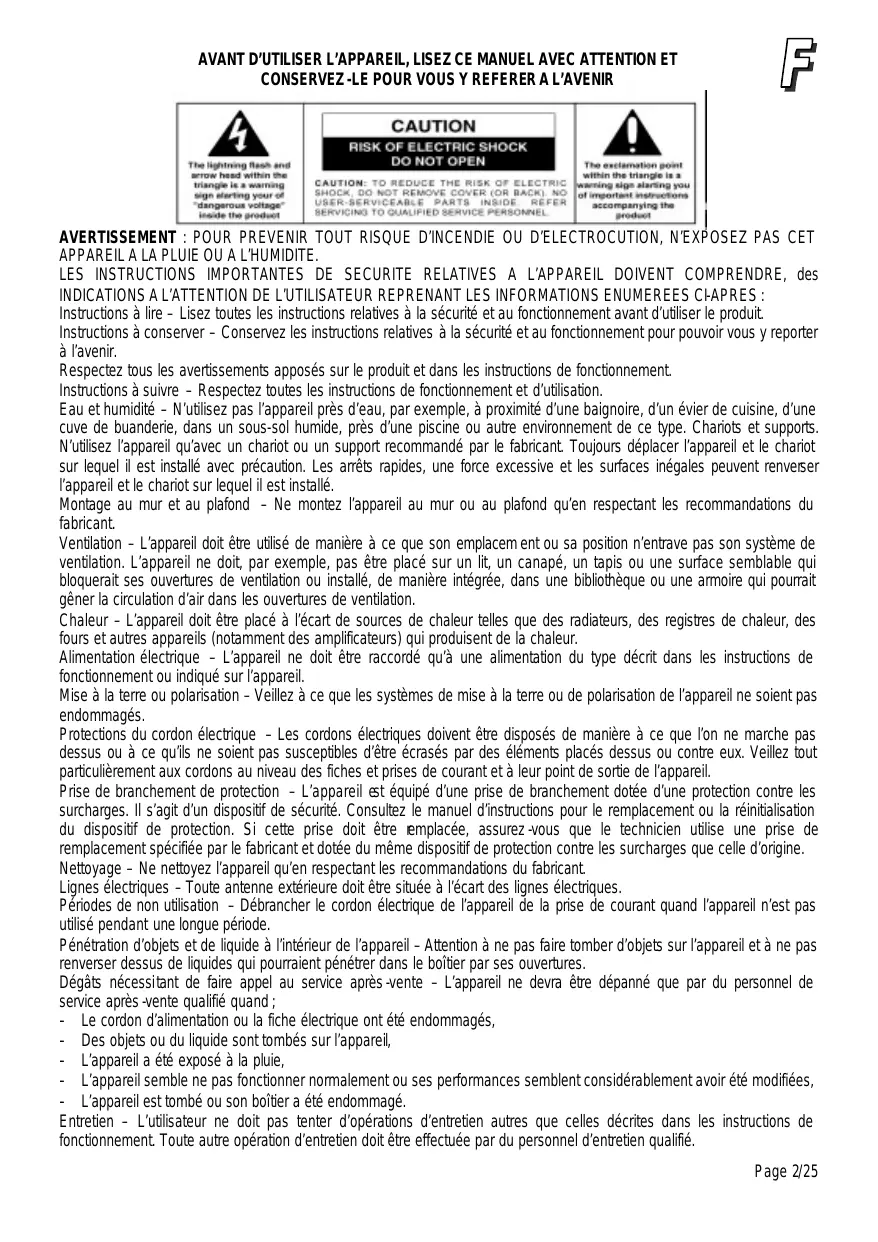APPAREIL A LA PLUIE OU A L’HUMIDITE. LES INSTRUCTIONS IMPORTANTES DE SECURITE RELATIVES A L’APPAREIL DOIVENT COMPRENDRE, des INDICATIONS A L’ATTENTION DE L’UTILISATEUR REPRENANT LES INFORMATIONS ENUMEREES CI-APRES : Instructions à lire – Lisez toutes les instructions relatives à la sécurité et au fonctionnement avant d’utiliser le produit. Instructions à conserver – Conservez les instructions relatives à la sécurité et au fonctionnement pour pouvoir vous y reporter à l’avenir. Respectez tous les avertissements apposés sur le produit et dans les instructions de fonctionnement. Instructions à suivre – Respectez toutes les instructions de fonctionnement et d’utilisation. Eau et humidité – N’utilisez pas l’appareil près d’eau, par exemple, à proximité d’une baignoire, d’un évier de cuisine, d’une cuve de buanderie, dans un sous-sol humide, près d’une piscine ou autre environnement de ce type. Chariots et supports. N’utilisez l’appareil qu’avec un chariot ou un support recommandé par le fabricant. Toujours déplacer l’appareil et le chariot sur lequel il est installé avec précaution. Les arrêts rapides, une force excessive et les surfaces inégales peuvent renverser l’appareil et le chariot sur lequel il est installé. Montage au mur et au plafond – Ne montez l’appareil au mur ou au plafond qu’en respectant les recommandations du fabricant. Ventilation – L’appareil doit être utilisé de manière à ce que son emplacem ent ou sa position n’entrave pas son système de ventilation. L’appareil ne doit, par exemple, pas être placé sur un lit, un canapé, un tapis ou une surface semblable qui bloquerait ses ouvertures de ventilation ou installé, de manière intégrée, dans une bibliothèque ou une armoire qui pourrait gêner la circulation d’air dans les ouvertures de ventilation. Chaleur – L’appareil doit être placé à l’écart de sources de chaleur telles que des radiateurs, des registres de chaleur, des fours et autres appareils (notamment des amplificateurs) qui produisent de la chaleur. Alimentation électrique – L’appareil ne doit être raccordé qu’à une alimentation du type décrit dans les instructions de fonctionnement ou indiqué sur l’appareil. Mise à la terre ou polarisation – Veillez à ce que les systèmes de mise à la terre ou de polarisation de l’appareil ne soient pas endommagés. Protections du cordon électrique – Les cordons électriques doivent être disposés de manière à ce que l’on ne marche pas dessus ou à ce qu’ils ne soient pas susceptibles d’être écrasés par des éléments placés dessus ou contre eux. Veillez tout particulièrement aux cordons au niveau des fiches et prises de courant et à leur point de sortie de l’appareil. Prise de branchement de protection – L’appareil est équipé d’une prise de branchement dotée d’une protection contre les surcharges. Il s’agit d’un dispositif de sécurité. Consultez le manuel d’instructions pour le remplacement ou la réinitialisation du dispositif de protection. Si cette prise doit être remplacée, assurez -vous que le technicien utilise une prise de remplacement spécifiée par le fabricant et dotée du même dispositif de protection contre les surcharges que celle d’origine. Nettoyage – Ne nettoyez l’appareil qu’en respectant les recommandations du fabricant. Lignes électriques – Toute antenne extérieure doit être située à l’écart des lignes électriques. Périodes de non utilisation – Débrancher le cordon électrique de l’appareil de la prise de courant quand l’appareil n’est pas utilisé pendant une longue période. Pénétration d’objets et de liquide à l’intérieur de l’appareil – Attention à ne pas faire tomber d’objets sur l’appareil et à ne pas renverser dessus de liquides qui pourraient pénétrer dans le boîtier par ses ouvertures. Dégâts nécessitant de faire appel au service après -vente – L’appareil ne devra être dépanné que par du personnel de service après -vente qualifié quand ; - Le cordon d’alimentation ou la fiche électrique ont été endommagés, - Des objets ou du liquide sont tombés sur l’appareil, - L’appareil a été exposé à la pluie, - L’appareil semble ne pas fonctionner normalement ou ses performances semblent considérablement avoir été modifiées, - L’appareil est tombé ou son boîtier a été endommagé. Entretien – L’utilisateur ne doit pas tenter d’opérations d’entretien autres que celles décrites dans les instructions de fonctionnement. Toute autre opération d’entretien doit être effectuée par du personnel d’entretien qualifié. Page 2/25 ATTENTION RAYONS LASERS INVISIBLES EN CAS D’OUVERTURE ET DE SUPPRESSION DES DISPOSITIFS DE VERROUILLAGE. EVITER TOUTE EXPOSITION AUX FAISCEAUX. Ce produit contient un appareil laser basse puissance. ! Respecter les conseils ci -dessous pour utiliser l’appareil correctement et en toute sécurité PROTECTION CONTRE LES EXPOSITIONS A L’ENERGIE LASER Le faisceau laser utilisé dans ce lecteur de disques compacts étant dangereux pour les yeux, n’essayez pas de démonter le boîtier de l’appareil. Arrêtez immédiatement le fonctionnement de l’appareil en cas de chute de liquide ou d’objet sur le boîtier. N’introduisez rien dans l’orifice de sécurité sans quoi la diode laser reste activée (ON) alors que la porte du CD est toujours ouverte. Si l’appareil n’est pas utilisé pendant une longue période, déconnecter toutes les alimentations électriques de l’appareil. Retirez toutes les batteries du compartiment des batteries et débranchez l’adaptateur c.a./c.c. de la prise murale. Pour ce faire, ne tirez pas sur le cordon mais saisissez le corps principal de l’adaptateur c.a./c.c. Cet appareil utilise un laser. L’utilisation de commandes, de réglages ou l’exécution de procédures autres que celles s