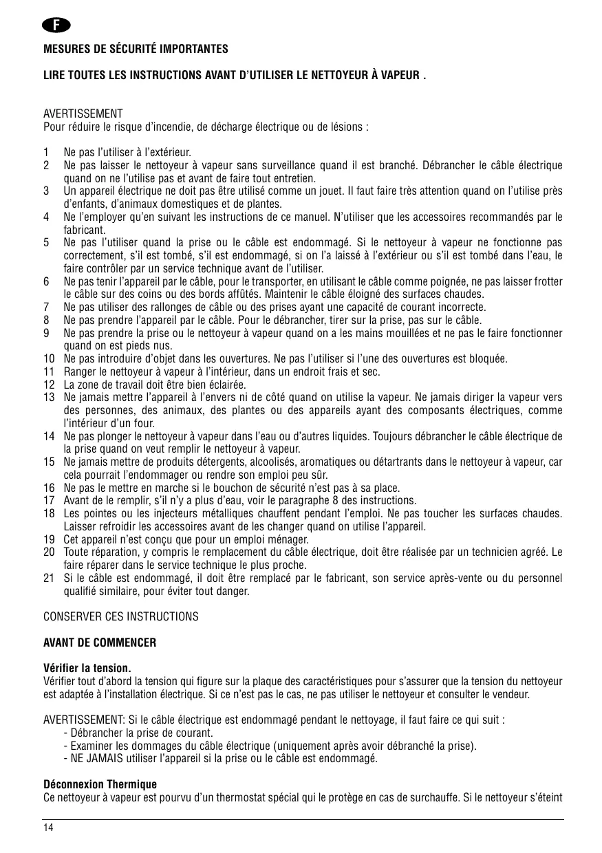 1 Ne pas l'utiliser à l'extérieur. 2 Ne pas laisser le nettoyeur à vapeur sans surveillance quand il est branché. Débrancher le câble électrique quand on ne l'utilise pas et avant de faire tout entretien. 3 Un appareil électrique ne doit pas être utilisé comme un jouet. Il faut faire très attention quand on l'utilise près d'enfants, d'animaux domestiques et de plantes. 4 Ne l'employer qu'en suivant les instructions de ce manuel. N'utiliser que les accessoires recommandés par le fabricant. 5 Ne pas l'utiliser quand la prise ou le câble est endommagé. Si le nettoyeur à vapeur ne fonctionne pas correctement, s'il est tombé, s'il est endommagé, s'il a été laissé à l'extérieur ou s'il est tombé dans l'eau, le faire contrôler par un service technique avant de l'utiliser. 6 Ne pas tenir l'appareil par le câble, pour le transporter, en utilisant le câble comme poignée, ne pas laisser frotter le câble sur des coins ou des bords affûtés. Maintenir le câble éloigné des surfaces chaudes. 7 Ne pas utiliser des rallonges de câble ou des prises ayant une capacité de courant incorrecte. 8 Ne pas prendre l'appareil par le câble. Pour le débrancher, tirer sur la prise, pas sur le câble. 9 Ne pas prendre la prise ou le nettoyeur à vapeur quand on a les mains mouillées et ne pas le faire fonctionner quand on est pieds nus. 10 Ne pas introduire d'objet dans les ouvertures. Ne pas l'utiliser si l'une des ouvertures est bloquée. 11 Ranger le nettoyeur à vapeur à l'intérieur, dans un endroit frais et sec. 12 La zone de travail doit être bien éclairée. 13 Ne jamais mettre l'appareil à l'envers ni de côté quand on utilise la vapeur. Ne jamais diriger la vapeur vers des personnes, des animaux, des plantes ou des appareils ayant des composants électriques, comme l'intérieur d'un four. 14 Ne pas plonger le nettoyeur à vapeur dans l'eau ou d'autres liquides. Toujours débrancher le câble électrique de la prise quand on peut remplir le nettoyeur à vapeur. 15 Ne jamais mettre de produits détergents, alcoolisés, aromatiques ou détartrants dans le nettoyeur à vapeur, car cela pourrait l'endommager ou rendre son emploi peu sûr. 16 Ne pas le mettre en marche si le bouchon de sécurité n'est pas à sa place. 17 Avant de le remplir, s'il n'y a plus d'eau, voir le paragraphe 8 des instructions. 18 Les pointes ou les injecteurs métalliques chauffent pendant l'emploi. Ne pas toucher les surfaces chaudes. Laisser refroidir les accessoires avant de les changer quand on utilise l'appareil. 19 Cet appareil n'est conçu que pour un emploi ménager. 20 Toute réparation, y compris le remplacement du câble électrique, doit être réalisée par un technicien agréé. Le faire réparer dans le service technique le plus proche. 21 Si le câble est endommagé, il doit être remplacé par le fabricant, son service après-vente ou du personnel qualifié similaire, pour éviter tout danger.