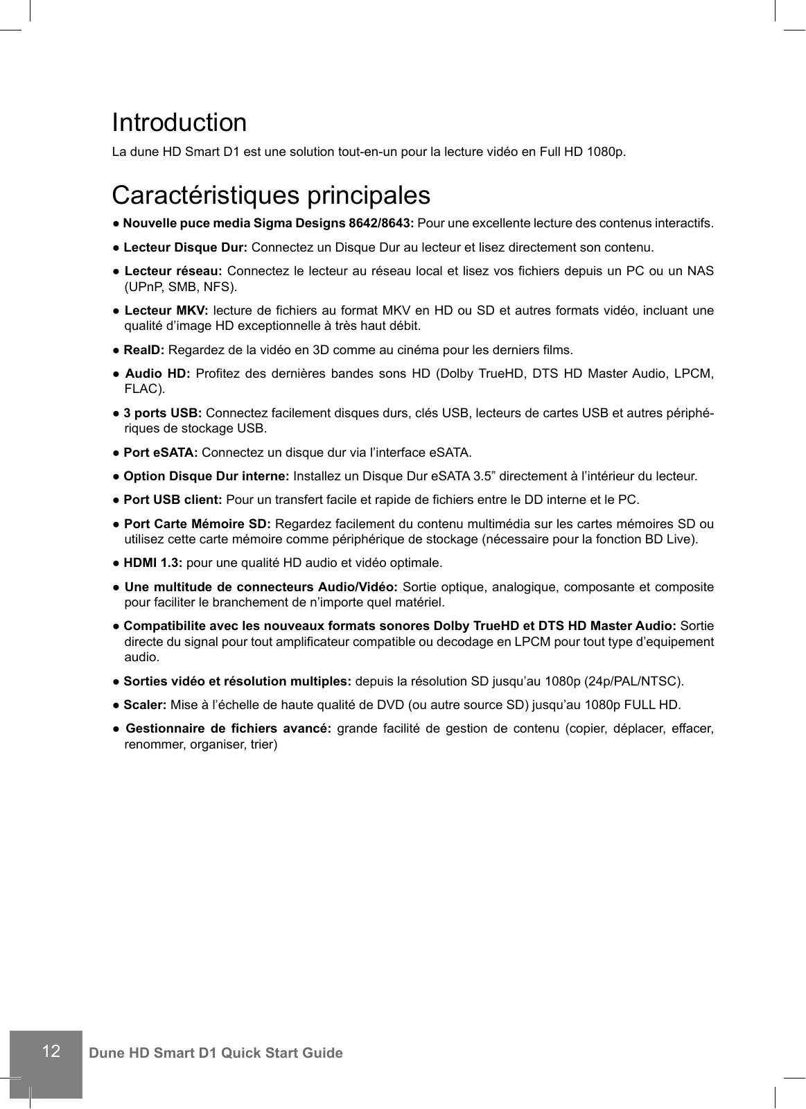 Introduction La dune HD Smart D1 est une solution tout-en-un pour la lecture vidéo en Full HD 1080p. Caractéristiques principales ● Nouvelle puce media Sigma Designs 8642/8643: Pour une excellente lecture des contenus interactifs. ● Lecteur Disque Dur: Connectez un Disque Dur au lecteur et lisez directement son contenu. ● Lecteur réseau: Connectez le lecteur au réseau local et lisez vos fichiers depuis un PC ou un NAS (UPnP, SMB, NFS). ● Lecteur MKV: lecture de fichiers au format MKV en HD ou SD et autres formats vidéo, incluant une qualité d’image HD exceptionnelle à très haut débit. ● RealD: Regardez de la vidéo en 3D comme au cinéma pour les derniers films. ● Audio HD: Profitez des dernières bandes sons HD (Dolby TrueHD, DTS HD Master Audio, LPCM, FLAC). ● 3 ports USB: Connectez facilement disques durs, clés USB, lecteurs de cartes USB et autres périphériques de stockage USB. ● Port eSATA: Connectez un disque dur via l’interface eSATA. ● Option Disque Dur interne: Installez un Disque Dur eSATA 3.5” directement à l’intérieur du lecteur. ● Port USB client: Pour un transfert facile et rapide de fichiers entre le DD interne et le PC. ● Port Carte Mémoire SD: Regardez facilement du contenu multimédia sur les cartes mémoires SD ou utilisez cette carte mémoire comme périphérique de stockage (nécessaire pour la fonction BD Live). ● HDMI 1.3: pour une qualité HD audio et vidéo optimale. ● Une multitude de connecteurs Audio/Vidéo: Sortie optique, analogique, composante et composite pour faciliter le branchement de n’importe quel matériel. ● Compatibilite avec les nouveaux formats sonores Dolby TrueHD et DTS HD Master Audio: Sortie directe du signal pour tout amplificateur compatible ou decodage en LPCM pour tout type d’equipement audio. ● Sorties vidéo et résolution multiples: depuis la résolution SD jusqu’au 1080p (24p/PAL/NTSC). ● Scaler: Mise à l’échelle de haute qualité de DVD (ou autre source SD) jusqu’au 1080p FULL HD. ● Gestionnaire de fichiers avancé: grande facilité de gestion de contenu (copier, déplacer, effacer, renommer, organiser, trier)