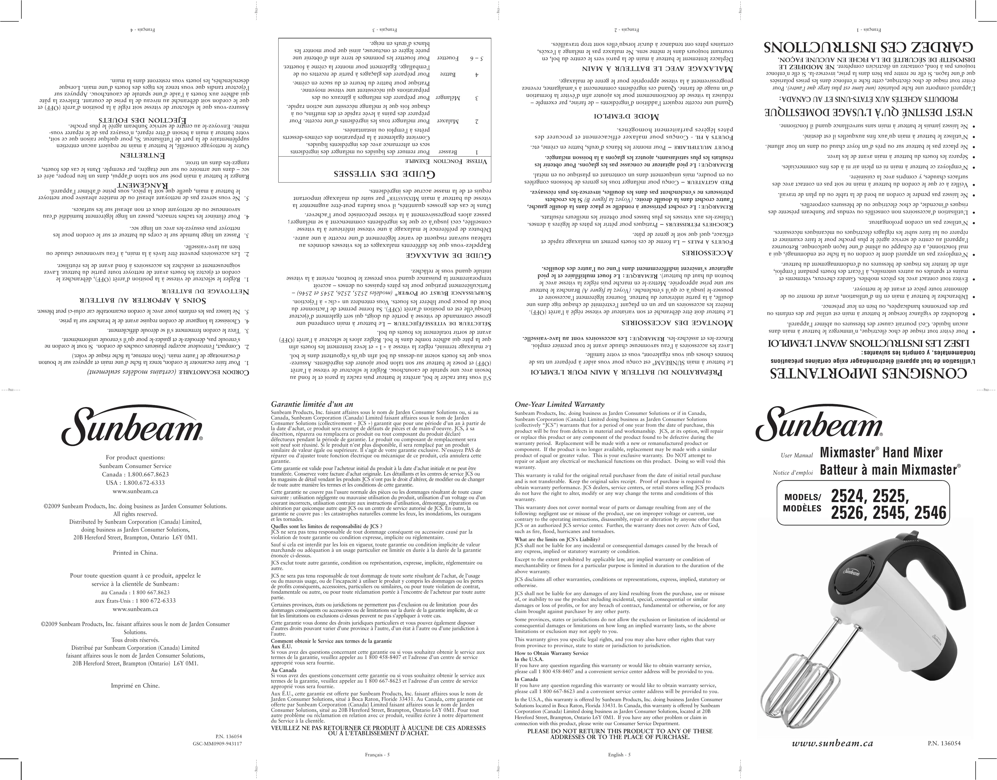 Sunbeam Products, Inc. faisant'affaires sous le nom de Jarden Consumer Solutions ou, si au Canada, Sunbeam Corporation (Canada) Limited faisant'affaires sous le nom de Jarden Consumer Solutions (collectivement « JCS ») garantit que pour une période d'un an à partir de la date d'achat, ce produit sera exempt de défauts de pieces et de main-d'oeuvre. JCS, à sa déscitation, réparée ou replacera ce produit ou tout composant du produit déclaré défectueux pendant la période de garantie. Le produit ou composant de replacement sera soit neuf soit réusine. Si le produit n'est plus disponible, il sera remplaced par un produit similaire de valeur égale ou supérieur. Il s'agit de votre garantie exclusive. N'essayez PAS de réparer ou d'ajuster toute fonction électrique ou mécanique de ce produit, cela annulera cette garantie.