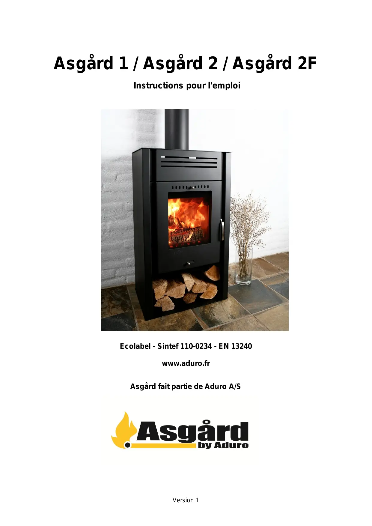 Asgård 1 / Asgård 2 / Asgård 2F Instructions pour l'emploi Ecolabel - Sintef 110-0234 - EN 13240 www.aduro.fr Asgård fait partie de Aduro A/S Version 1 Bonne chance avec votre nouveau poêle Asgård! Pour pouvoir jouir et profiter au mieux de votre nouveau poêle à bois Asgård, il importe que vous lisiez minutieusement le manuel d’utilisation avant d’installer le poêle et de le mettre en service.
