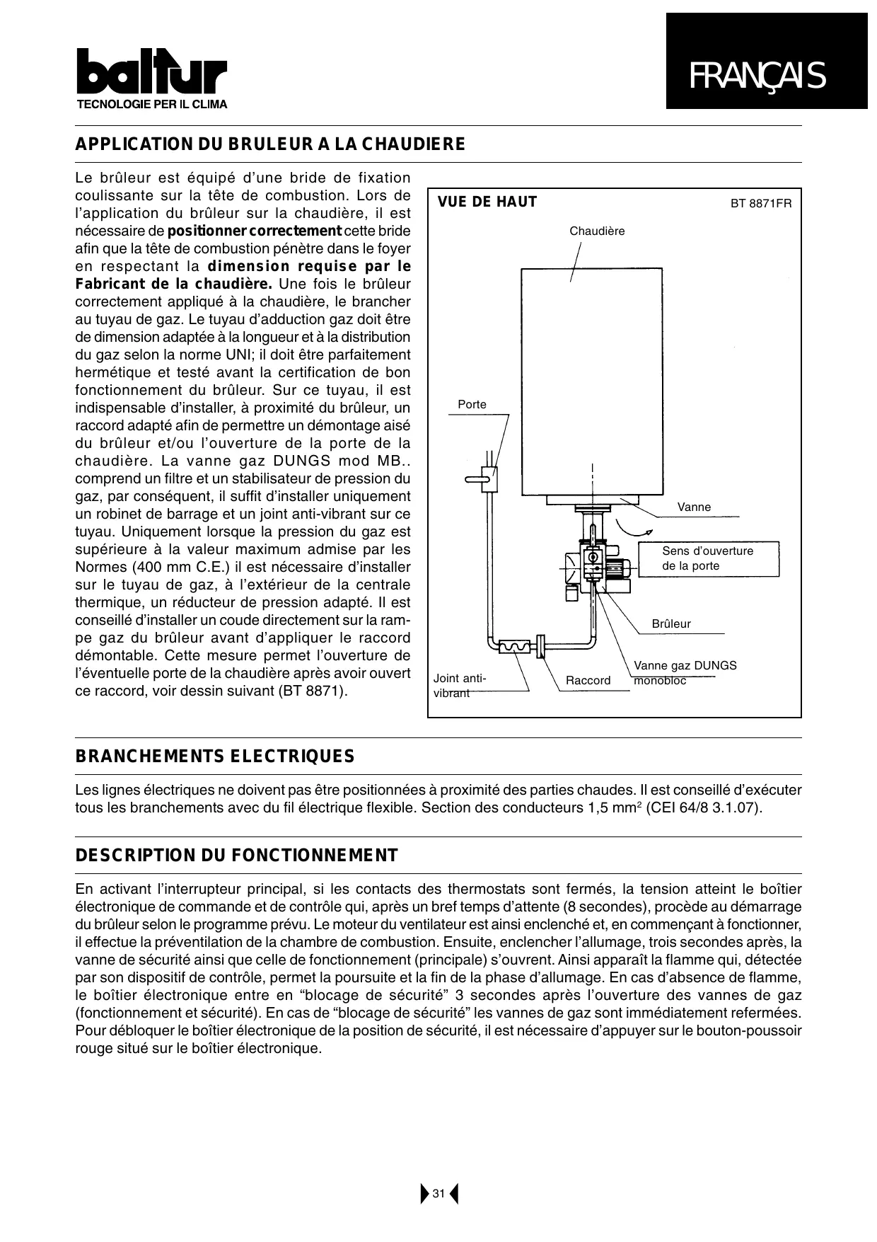 BT 8871FR Chaudière Porte Vanne Sens d’ouverture de la porte Brûleur Joint antivibrant Raccord Vanne gaz DUNGS monobloc BRANCHEMENTS ELECTRIQUES Les lignes électriques ne doivent pas être positionnées à proximité des parties chaudes. Il est conseillé d’exécuter tous les branchements avec du fil électrique flexible. Section des conducteurs 1,5 mm2 (CEI 64/8 3.1.07).