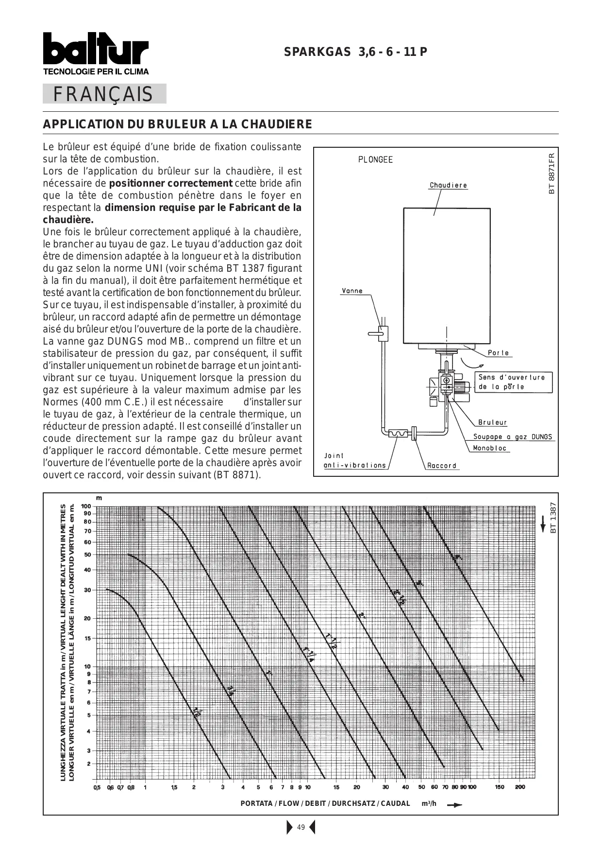 LUNGHEZZA VIRTUALE TRATTA in m / VIRTUAL LENGHT DEALT WITH IN METRES LONGUER VIRTUELLE en m / VIRTUELLE LÄNGE in m / LONGITUD VIRTUAL en m. BT 1387 BT 8871FR Le brûleur est équipé d’une bride de fixation coulissante sur la tête de combustion. Lors de l’application du brûleur sur la chaudière, il est nécessaire de positionner correctement cette bride afin que la tête de combustion pénètre dans le foyer en respectant la dimension requise par le Fabricant de la chaudière. Une fois le brûleur correctement appliqué à la chaudière, le brancher au tuyau de gaz. Le tuyau d’adduction gaz doit être de dimension adaptée à la longueur et à la distribution du gaz selon la norme UNI (voir schéma BT 1387 figurant à la fin du manual), il doit être parfaitement hermétique et testé avant la certification de bon fonctionnement du brûleur. Sur ce tuyau, il est indispensable d’installer, à proximité du brûleur, un raccord adapté afin de permettre un démontage aisé du brûleur et/ou l’ouverture de la porte de la chaudière. La vanne gaz DUNGS mod MB.. comprend un filtre et un stabilisateur de pression du gaz, par conséquent, il suffit d’installer uniquement un robinet de barrage et un joint antivibrant sur ce tuyau. Uniquement lorsque la pression du gaz est supérieure à la valeur maximum admise par les Normes (400 mm C.E.) il est nécessaire d’installer sur le tuyau de gaz, à l’extérieur de la centrale thermique, un réducteur de pression adapté. Il est conseillé d’installer un coude directement sur la rampe gaz du brûleur avant d’appliquer le raccord démontable. Cette mesure permet l’ouverture de l’éventuelle porte de la chaudière après avoir ouvert ce raccord, voir dessin suivant (BT 8871).