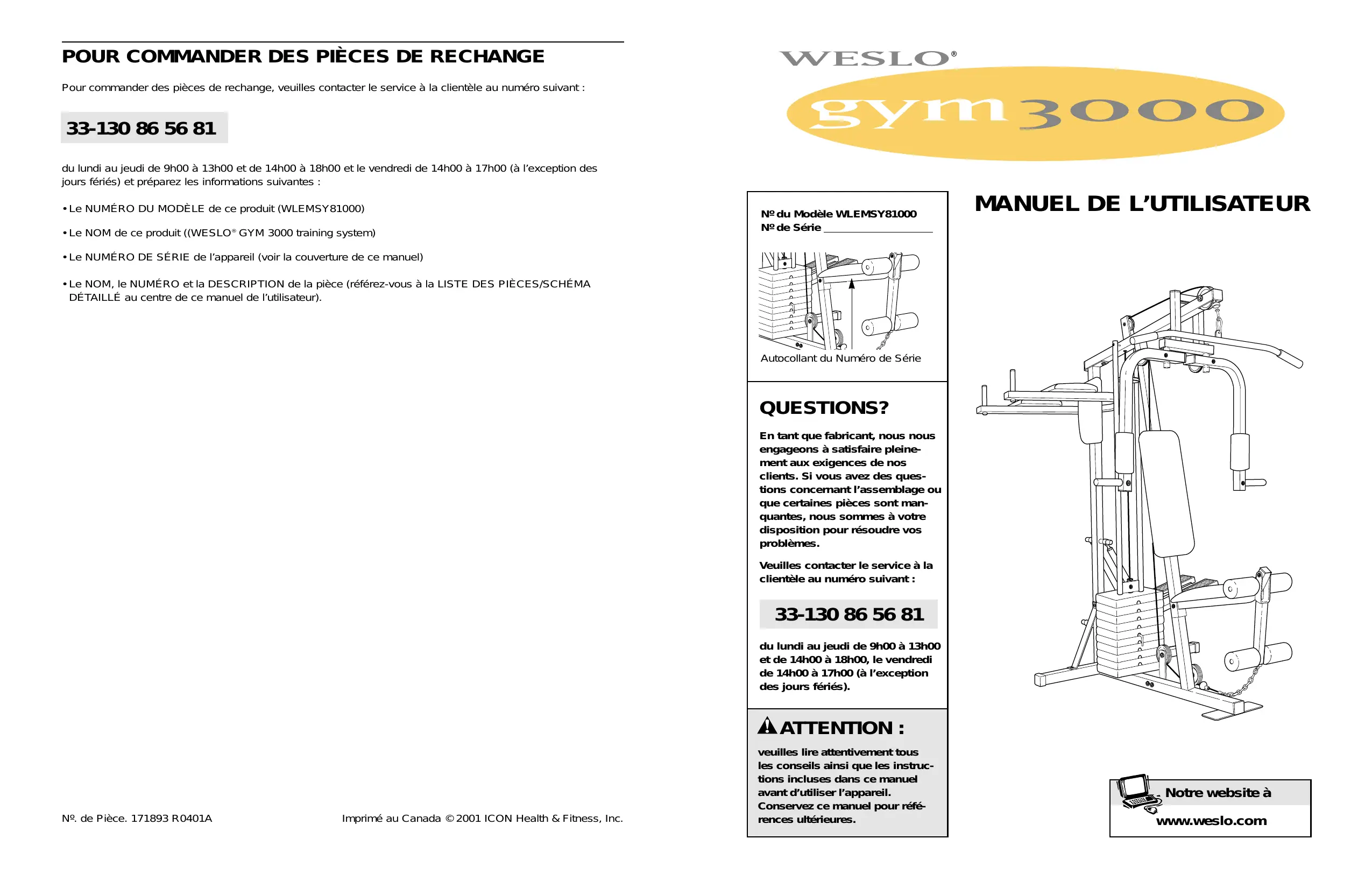 Pour votre bénéfice, veuilles lire attentivement ce manuel avant d'utiliser de WESLO® GYM 3000. Si