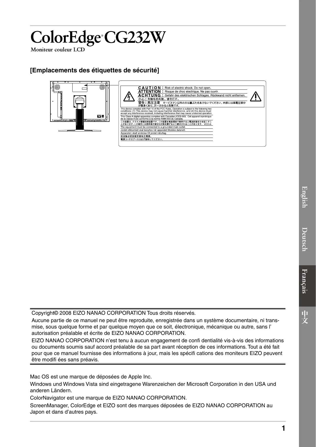 RE) Copyright© 2008 EIZO NANAO CORPORATION Tous droits réservés. Aucune partie de ce manuel ne peut être reproduite, enregistrée dans un système documentaire, ni trans- mise, sous quelque forme et par quelque moyen que ce soit, électronique, mécanique ou autre, sans l autorisation préalable et écrite de E1ZO NANAO CORPORATION. EIZO NANAO CORPORATION n'est tenu à aucun engagement de confi dentialité vis-à-vis des informations ou documents soumis sauf accord préalable de sa part avant réception de ces informations. Tout a été fait pour que ce manuel fournisse des informations à jour, mais les spécifi cations des moniteurs EIZO peuvent être modifi ées sans préavis. Mac OS est une marque de déposées de Apple Inc. Windows und Windows Vista sind eingetragene Warenzeichen der Microsoft Corporation in den USA und anderen Ländern. ColorNavigator est une marque de EIZO NANAO CORPORATION. ScreenManager, ColorEdge et EIZO sont des marques déposées de E1ZO NANAO CORPORATION au Japon et dans d’autres pays.