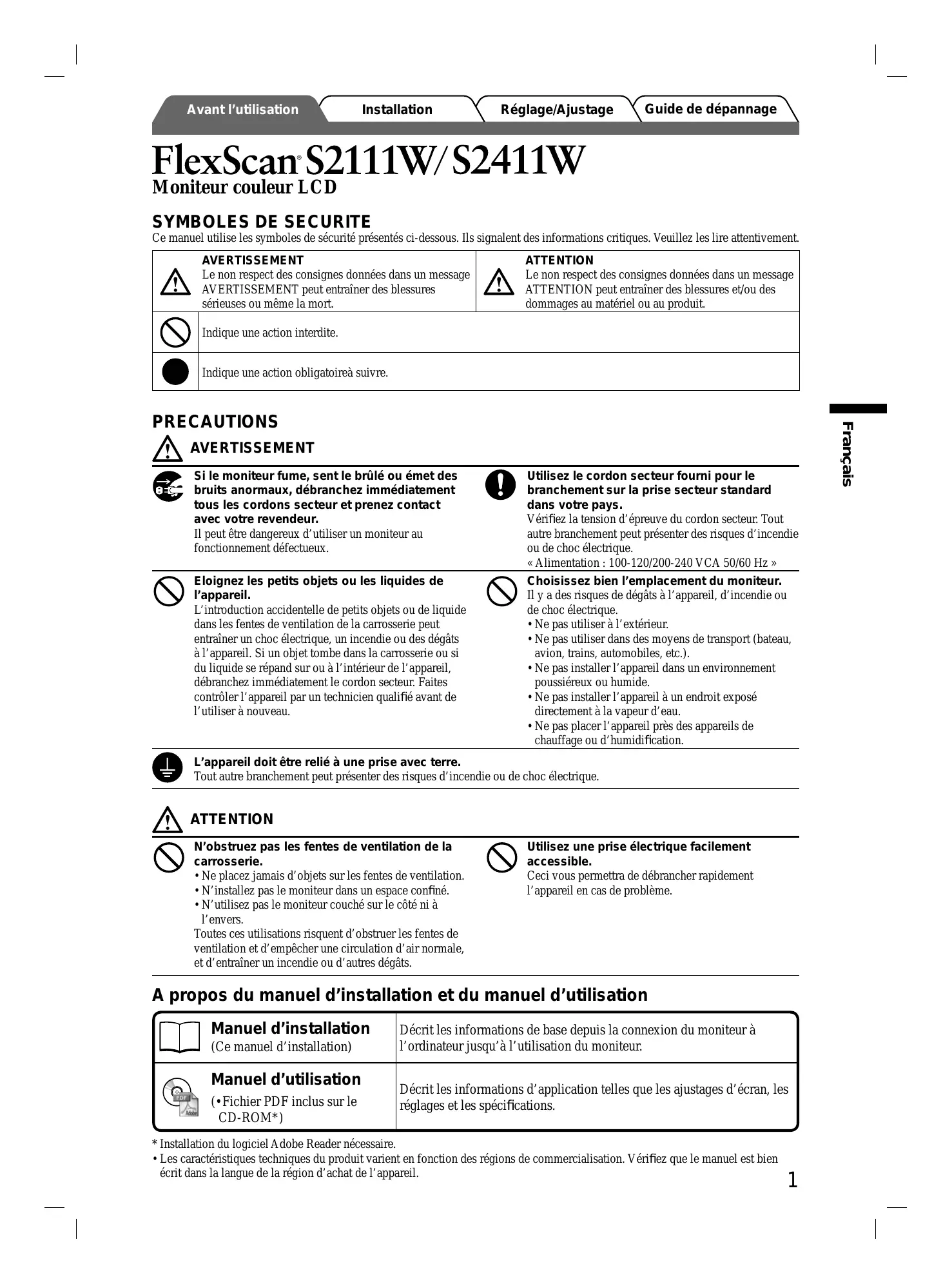 Installation Réglage/Ajustage Guide de dépannage FlexScan S2111W/S2411W Moniteur couleur LCD