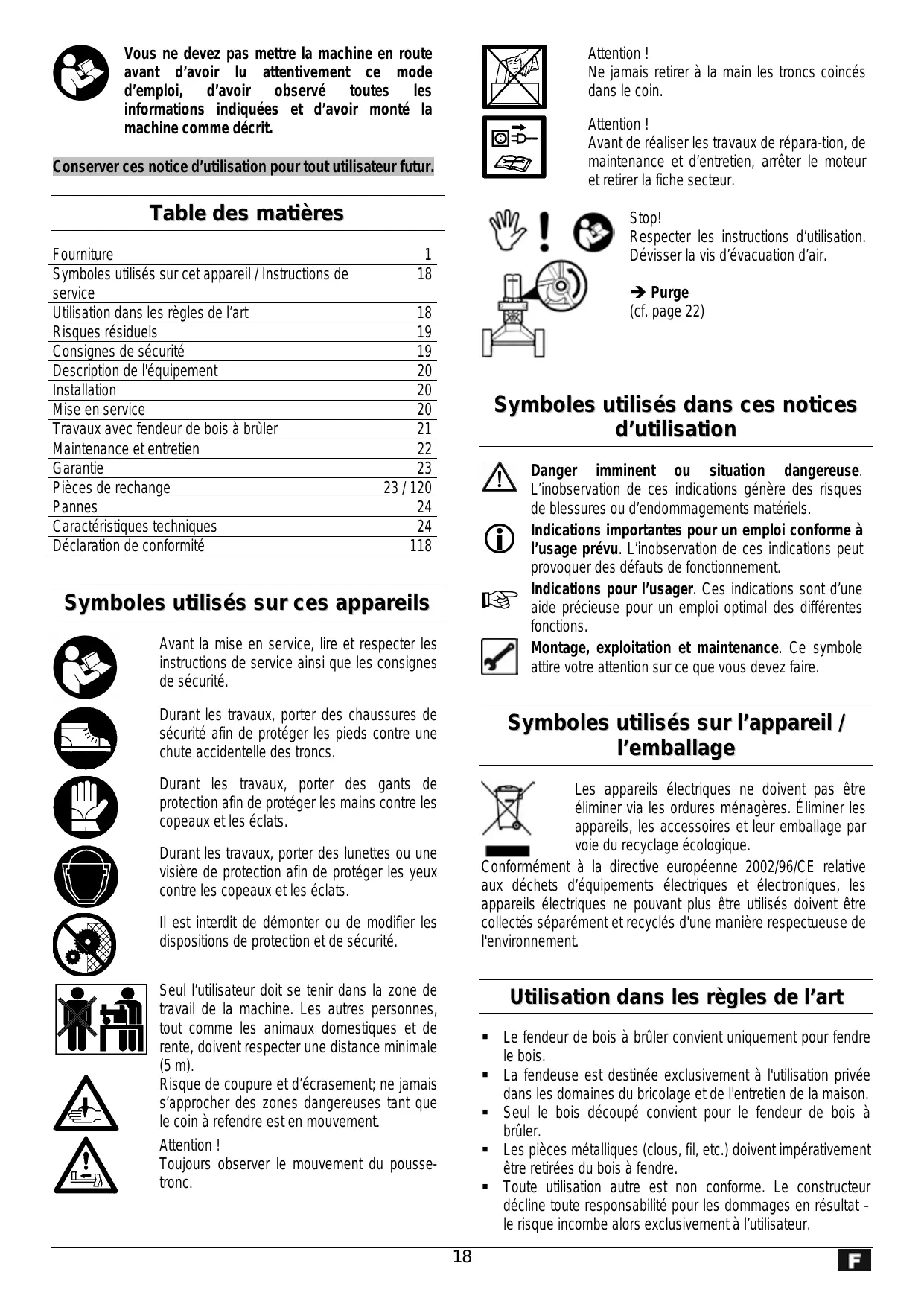 Symboles utilisés dans ces notices d’utilisation Avant la mise en service, lire et respecter les instructions de service ainsi que les consignes de sécurité. Durant les travaux, porter des chaussures de sécurité afin de protéger les pieds contre une chute accidentelle des troncs. Danger imminent ou situation dangereuse. L’inobservation de ces indications génère des risques de blessures ou d’endommagements matériels. Indications importantes pour un emploi conforme à l’usage prévu. L’inobservation de ces indications peut provoquer des défauts de fonctionnement. Indications pour l’usager. Ces indications sont d’une aide précieuse pour un emploi optimal des différentes fonctions. Montage, exploitation et maintenance. Ce symbole attire votre attention sur ce que vous devez faire. Symboles utilisés sur l’appareil / l’emballage Durant les travaux, porter des gants de protection afin de protéger les mains contre les copeaux et les éclats. Les appareils électriques ne doivent pas être éliminer via les ordures ménagères. Éliminer les appareils, les accessoires et leur emballage par voie du recyclage écologique. Conformément à la directive européenne 2002/96/CE relative aux déchets d’équipements électriques et électroniques, les appareils électriques ne pouvant plus être utilisés doivent être collectés séparément et recyclés d'une manière respectueuse de l'environnement. Durant les travaux, porter des lunettes ou une visière de protection afin de protéger les yeux contre les copeaux et les éclats. Il est interdit de démonter ou de modifier les dispositions de protection et de sécurité. Seul l’utilisateur doit se tenir dans la zone de travail de la machine. Les autres personnes, tout comme les animaux domestiques et de rente, doivent respecter une distance minimale (5 m). Risque de coupure et d’écrasement; ne jamais s’approcher des zones dangereuses tant que le coin à refendre est en mouvement. Attention ! Toujours observer le mouvement du poussetronc. Utilisation dans les règles de l’art Le fendeur de bois à brûler convient uniquement pour fendre le bois. La fendeuse est destinée exclusivement à l'utilisation privée dans les domaines du bricolage et de l'entretien de la maison. Seul le bois découpé convient pour le fendeur de bois à brûler. Les pièces métalliques (clous, fil, etc.) doivent impérativement être retirées du bois à fendre. Toute utilisation autre est non conforme. Le constructeur décline toute responsabilité pour les dommages en résultat – le risque incombe alors exclusivement à l’utilisateur.