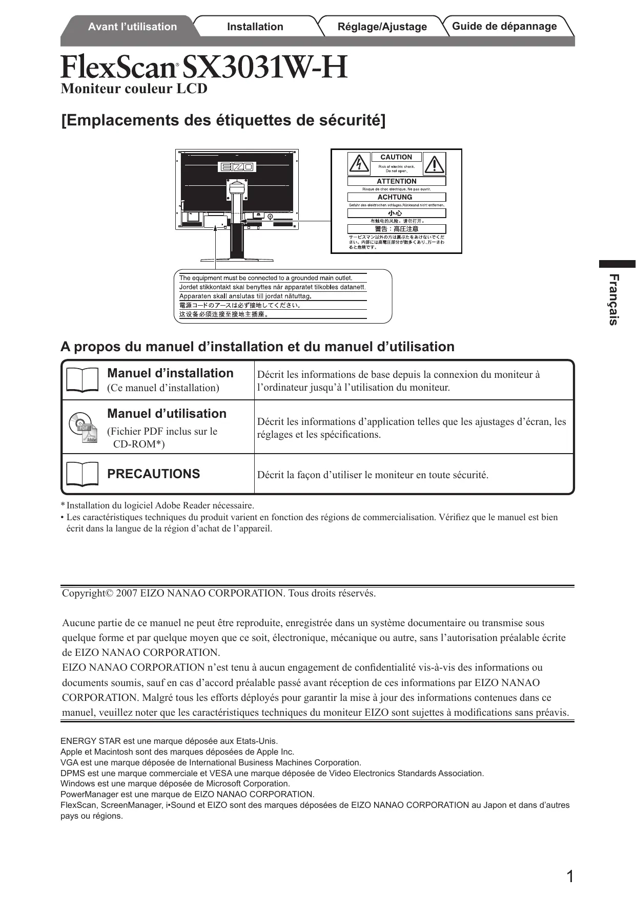 - Installation du logiciel Adobe Reader nécessaire. + Les caractéristiques techniques du produit varient en fonction des régions de commercialisation. Vérifiez que le manuel est bien écrit dans la langue de la région d'achat de l'appareil. Copyright© 2007 EIZO NANAO CORPORATION. Tous droits réservés. Aucune partie de ce manuel ne peut être reproduite, enregistrée dans un système documentaire ou transmise sous quelque forme et par quelque moyen que ce soit, électronique, mécanique ou autre, sans l’autorisation préalable écrite de EIZO NANAO CORPORATION. EIZO NANAO CORPORATION n’est tenu à aucun engagement de confidentialité vis-à-vis des informations ou documents soumis, sauf en cas d’accord préalable passé avant réception de ces informations par EIZO NANAO CORPORATION. Malgré tous les efforts déployés pour garantir la mise à jour des informations contenues dans ce manuel, veuillez noter que les caractéristiques techniques du moniteur EIZO sont sujettes à modifications sans préavis. ENERGY STAR est une marque déposée aux Etats-Unis. Apple et Macintosh sont des marques déposées de Apple Inc. VGA est une marque déposée de International Business Machines Corporation. DPMS est une marque commerciale et VESA une marque déposée de Video Electronics Standards Association. Windows est une marque déposée de Microsoft Corporation. PowerManager est une marque de EIZO NANAO CORPORATION. FlexScan, ScreenManager, i-Sound et EIZO sont des marques déposées de EIZO NANAO CORPORATION au Japon et dans d'autres pays ou régions. siesue1 |