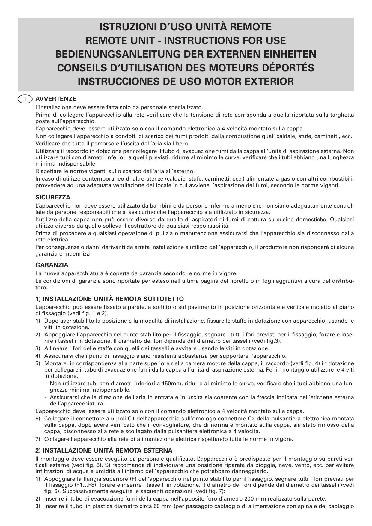 1) Après avoir déterminé la position et les conditions d'installation, fixer les étriers fournis avec l'appareil avec les vis fournies. 2) Poser l'appareil à l'emplacement voulu pour la fixation, marquer tous les trous prévus pour la fixation, percer et insérer les chevilles fournies. Le diamètre des trous dépend du diamètre des chevilles (cf. fig. 3). 3) Aligner les trous des étriers avec ceux des chevilles et visser avec les vis fournies. 4) S'assurer que les points de fixation sont suffisamment résistants pour supporter l'appareil. 5) Monter, en le faisant coïncider avec la partie supérieure du caisson moteur de la hotte, le raccord (cf. fig. 4) fourni pour raccorder la tuyau d'évacuation des fumées de la hotte à l'unité d'aspiration extérieure. Pour le montage utiliser les 4 vis fournies.