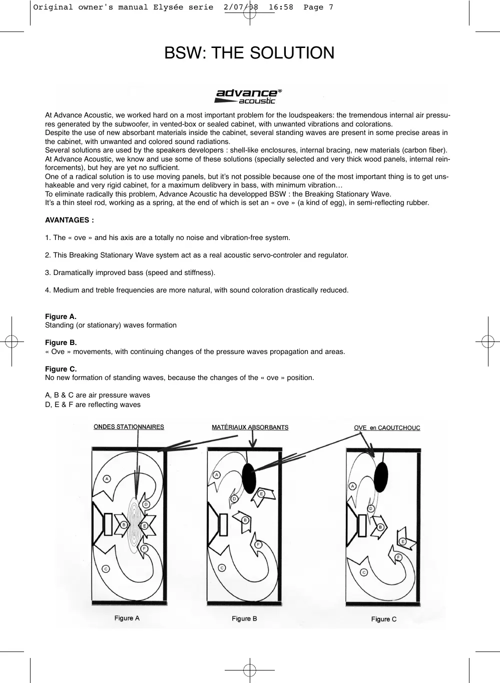 Pour éliminer ce problème, Advance Acoustic a mis au point le système BSW (Breaking Stationary Wave). Ce système est constitué d'une fine tige d'acier, servant de ressort, au bout de laquelle, est fixé un ove en caoutchou semi réverberant.