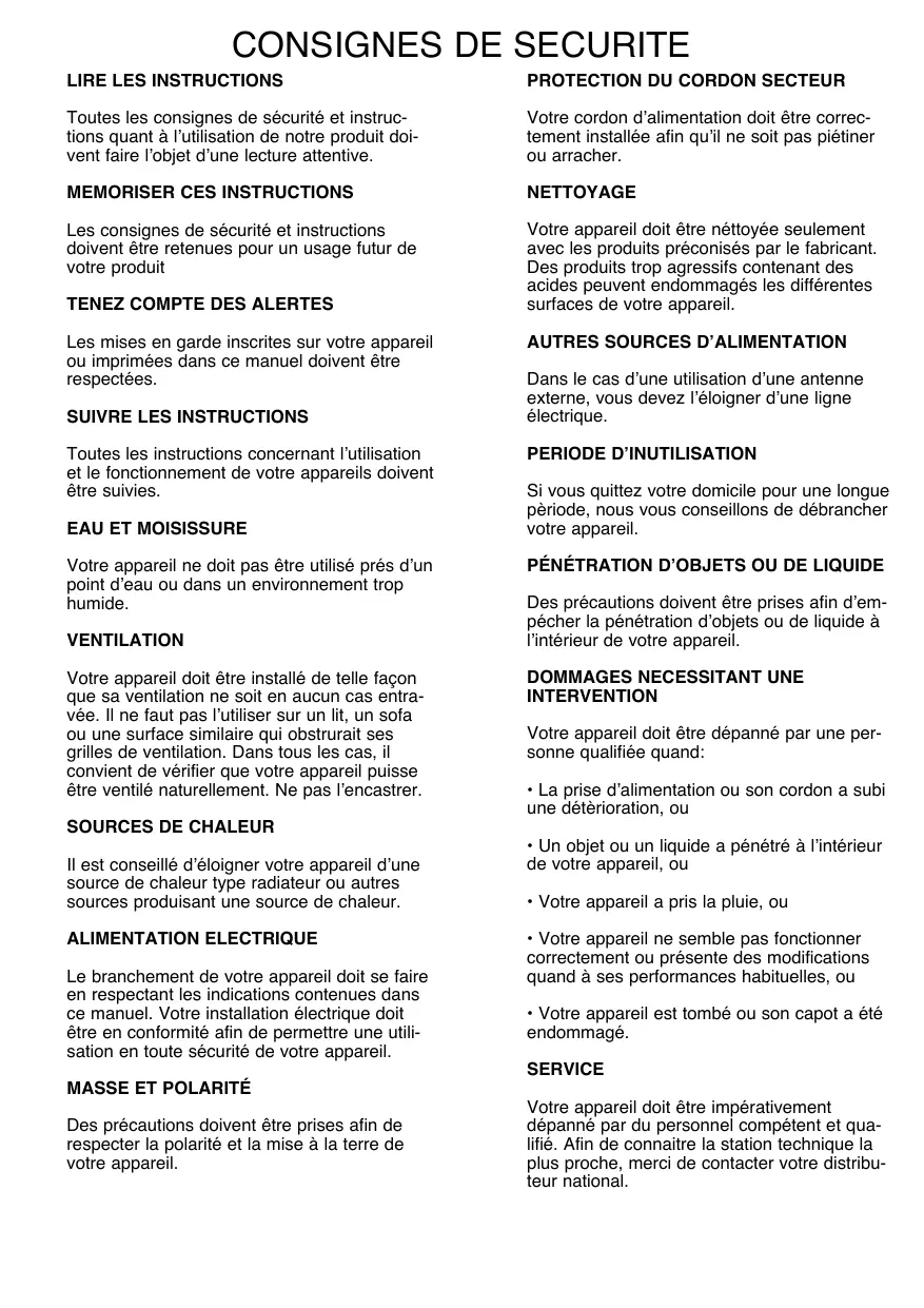 Les consignes de sécurité et instructions doivent être retenues pour un usage futur de votre produit