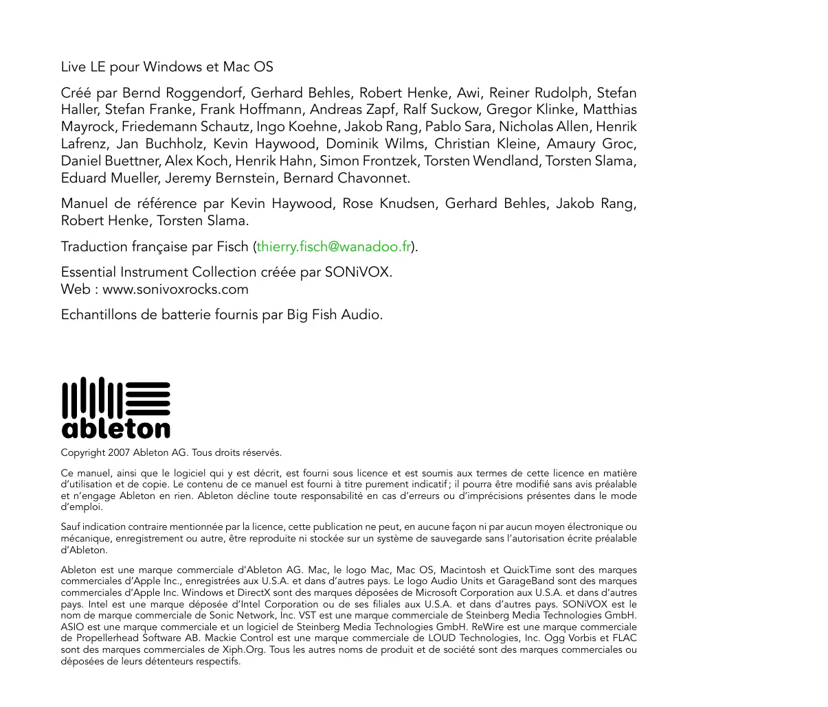 Ce manuel, ainsi que le logiciel qui y est décrit, est fourni sous licence et est soumis aux termes de cette licence en matière d'utilisation et de copie. Le contenu de ce manuel est fourni à titre purement indicatif; il pourra être modifié sans avis prétable et n'engage Ableton en rien. Ableton decline toute responsabilité en cas d'erreurs ou d'impréciations générées dans le mode d'emploi.