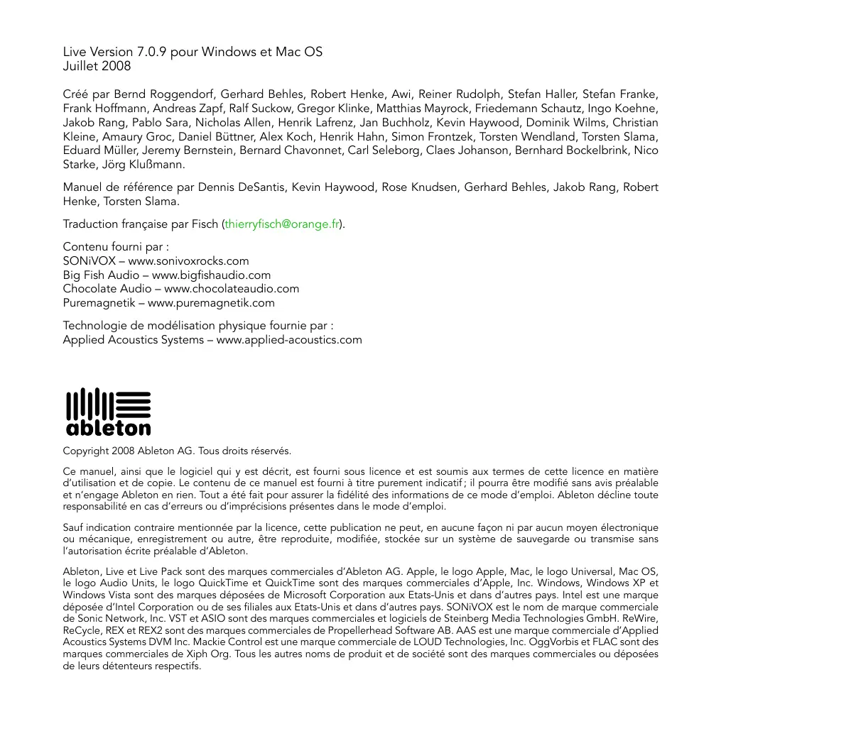 ableton Copyright 2008 Ableton AG. Tous droits réservés Ce manuel, ainsi que le logiciel qui y est décrit, est fourni sous licence et est soumis aux termes de cette licence en matière d'utilisation et de copie. Le contenu de ce manuel est fourni à titre purement indicatif; il pourra être modifié sans avis préalable et n'engage Ableton en rien. Tout a été fait pour assurer la fidélité des informations de ce mode d'emploi. Ableton décline toute responsabilité en cas d'erreurs ou d'imprécisions présentes dans le mode d'emploi Sauf indication contraire mentionnée par la licence, cette publication ne peut, en aucune façon ni par aucun moyen électronique ou mécanique, enregistrement ou autre, être reproduite, modifiée, stockée sur un système de sauvegarde où transmise sans l'autorisation écrite préalable d'Ableton Ableton, Live et Live Pack sont des marques commerciales d'Ableton AG. Apple, le logo Apple, Mac, le logo Universal, Mac OS, le logo Audio Units, le logo QuickTime et QuickTime sont des marques commerciales d'Apple, Inc. Windows, Windows XP et Windows Vista sont des marques déposées de Microsoft Corporation aux Etats-Unis et dans d'autres pays. Intel est une marque déposée d'Intel Corporation ou de ses filiales aux Etats-Unis et dans d'autres pays. SONIVOX est le nom de marque commerciale de Sonic Network, Inc. VST et ASIO sont des marques commerciales et logiciels de Steinberg Media Technologies GmbH. ReWire, ReCycle, REX et REX2 sont des marques commerciales de Propellerhead Software AB. AAS est une marque commerciale d'Applied Acoustics Systems DVM Inc. Mackie Control est une marque commerciale de LOUD Technologies, Inc. OggVorbis et FLAC sont des marques commerciales de Xiph Org. Tous les autres noms de produit et de société sont des marques commerciales ou déposées de leurs détenteurs respectifs