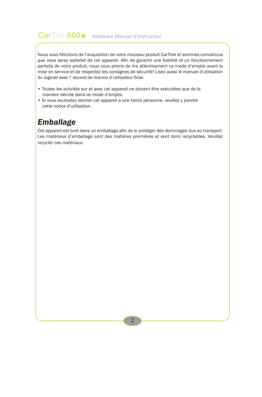 Téléchargez la notice de votre Gps au format PDF gratuitement ! Retrouvez votre notice 600 - CARTREK et reprennez votre appareil électronique en main. Sur cette page sont publiés tous les documents nécessaires à l'utilisation de votre appareil 600 de la marque CARTREK.