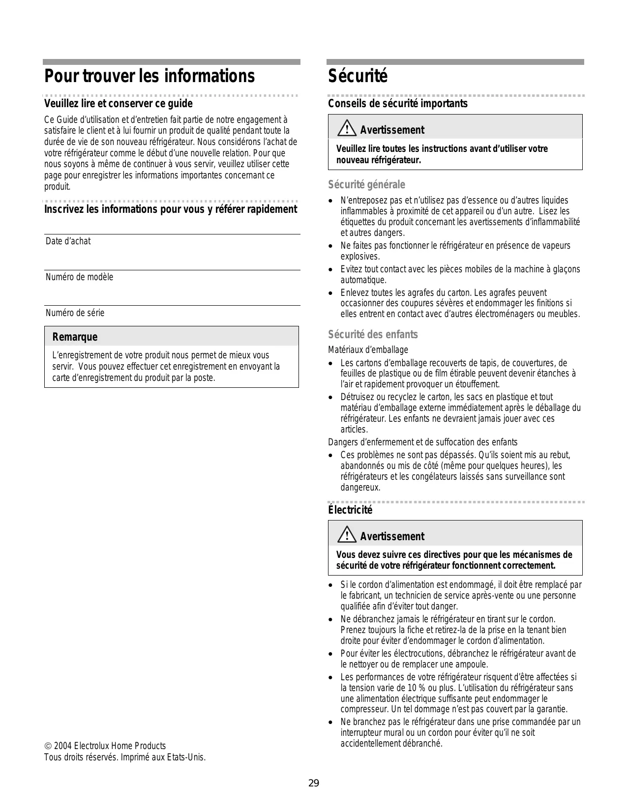 - Ne branchez pas le réfrigérateur dans une prise commandée par un interrupteur mural ou un cordon pour éviter qu’il ne soit accidentellement débranché. © 2004 Electrolux Home Products Tous droits réservés. Imprimé aux Etats-Unis.