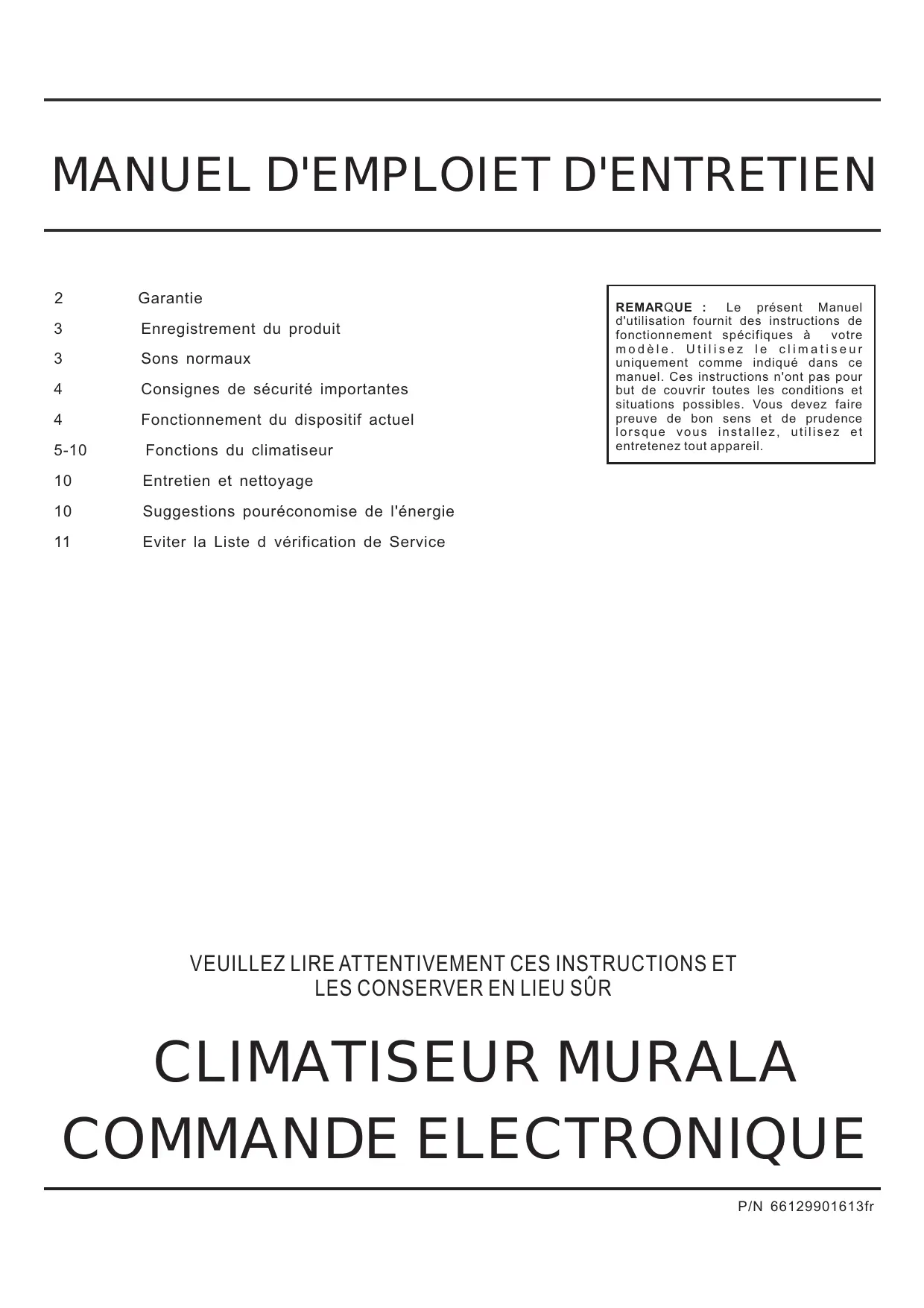 REMARQUE: Le présente Manuel d'utilisation fournit des instructions de fonctionnement spécifiques à votre modele. Utilisez le climatisationur uniquement comme indiquedans ce manuel. Ces instructions n'ont pas pour but de couvir toutes les conditions et situations possibles. Vousdez faire preuve de bon sens et de prudence lorsque vous installez,utilisez et entretenez tout appareil.