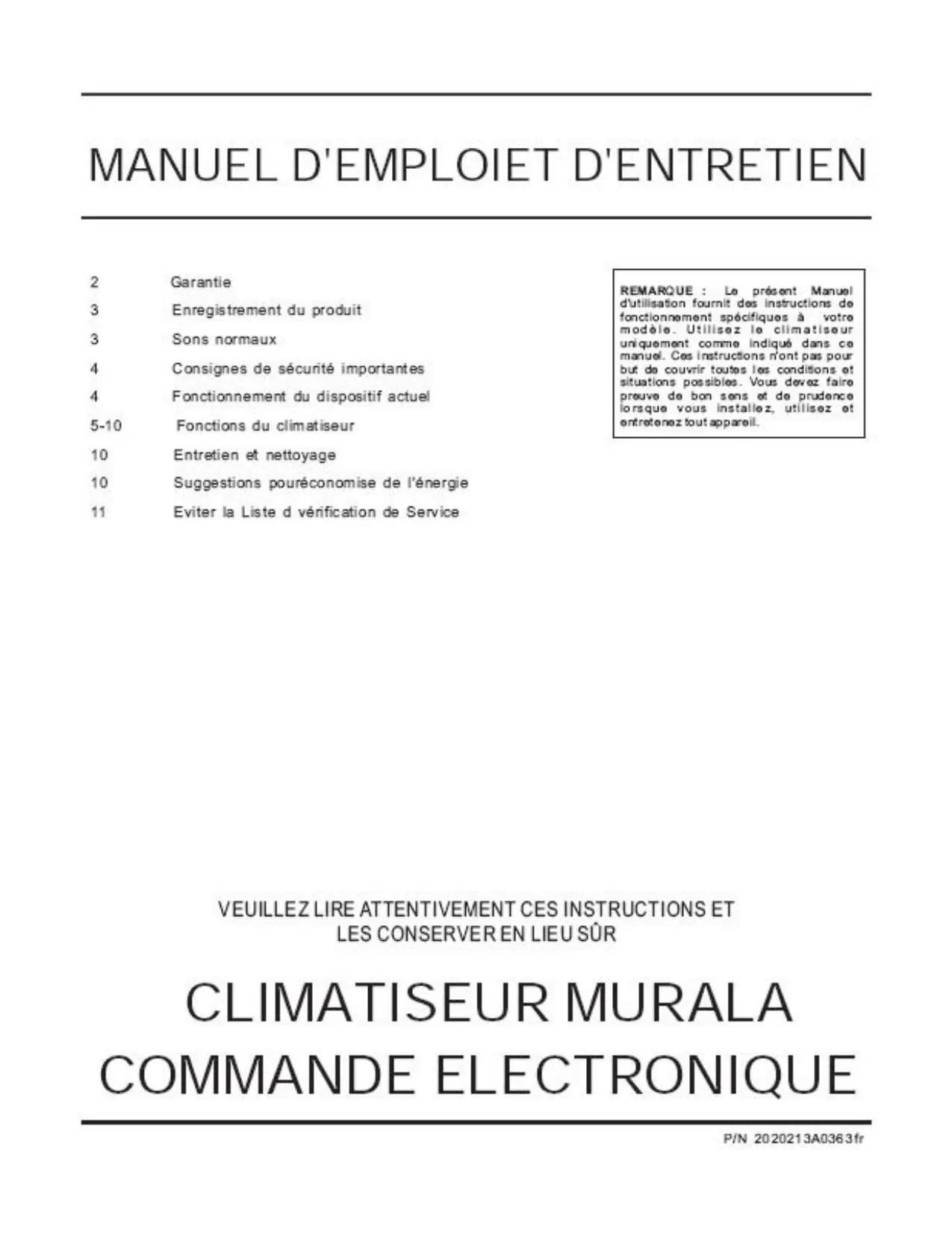 REMARQUE: Le present Manuel d'utilisation fournit des instructions de fonctionnement spécifiques à vous modèle. Utilisez le climatiseur uniquement comme indiqued dans ce manuel. Ces instructions n'ont pas pour but de couvir toutes les conditions et situations possibles. Vous devez faire preuve de bon sens et de prudence lorsque vous installez, utilisez et entretenez tout apparail.