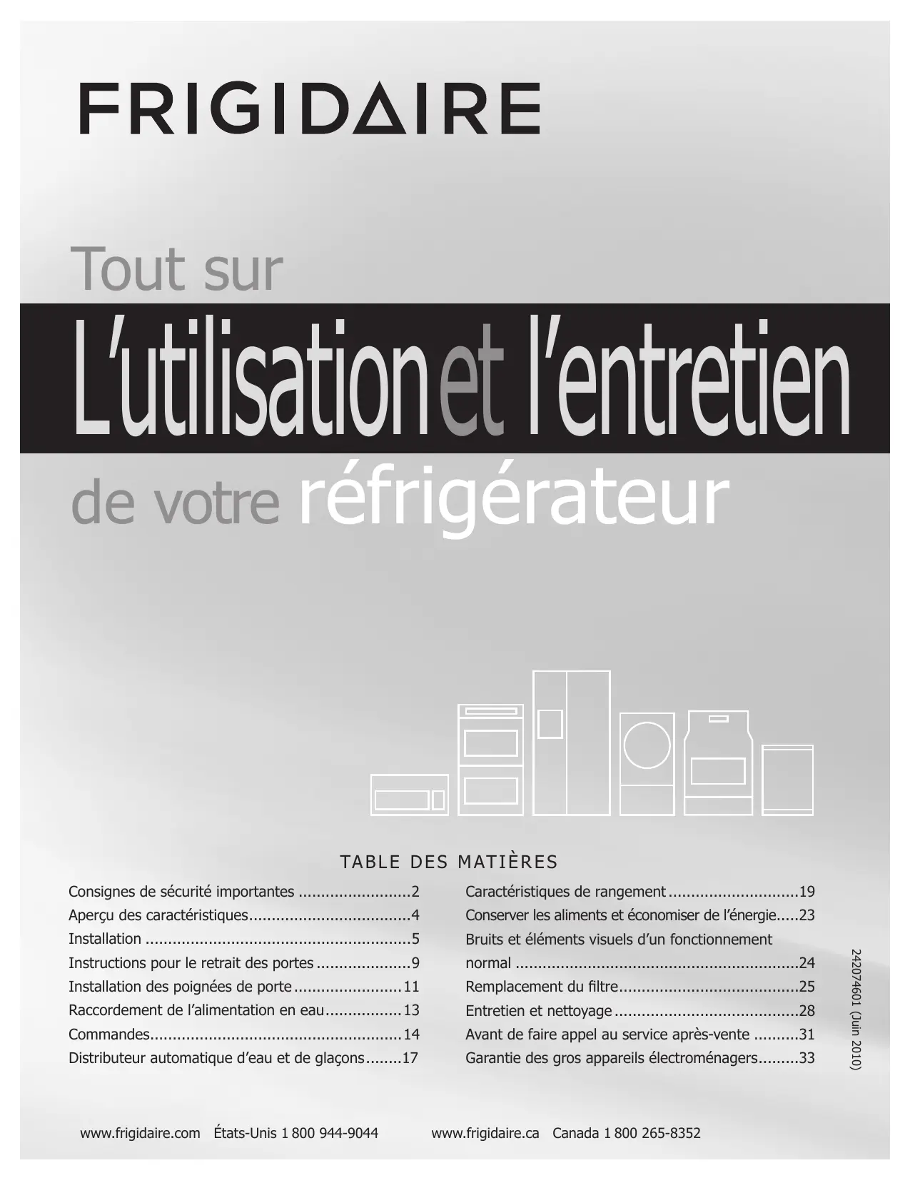 - www.frigidaire.com États-Unis 1 800 944-9044 www.frigidaire.ca Canada 1 800 265-8352 242074601 (Juin 2010) Consignes de sécurité importantes Consignes de sécurité importantes Liste de vérification pour l’installation AVERTISSEMENT Veuillez lire ces instructions au complet avant d’utiliser le réfrigérateur. Pour votre sécurité p. 2