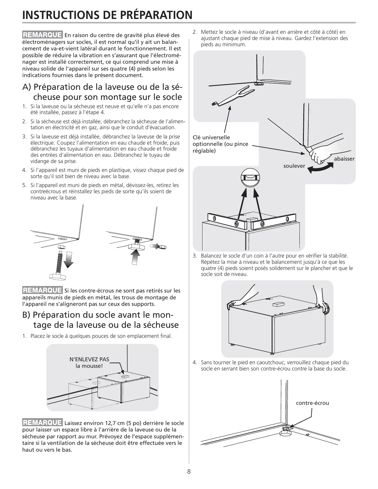 ajustant chaque pied de mise à niveau. Gardez l’extension des pieds au minimum. En raison du centre de gravité plus élevé des électroménagers sur socles, il est normal qu’il y ait un balancement de va-et-vient latéral durant le fonctionnement. Il est possible de réduire la vibration en s’assurant que l’électroménager est installé correctement, ce qui comprend une mise à niveau solide de l’appareil sur ses quatre (4) pieds selon les indications fournies dans le présent document. A) Préparation de la laveuse ou de la sécheuse pour son montage sur le socle