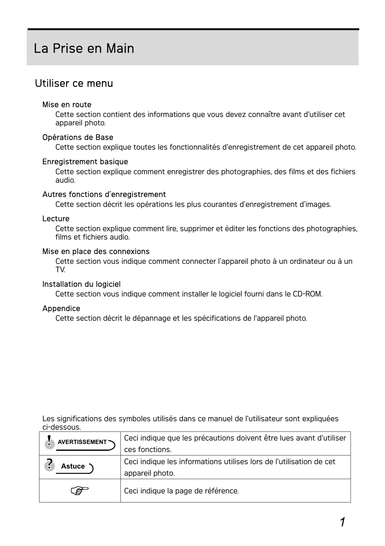 Les significations des symboles utilisés dans ce manuel de l'utilisateur sont expliquées ci-dessous.