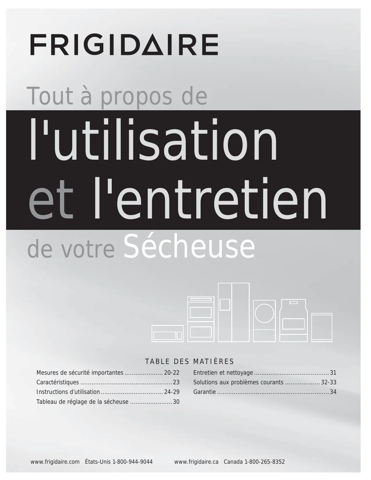 - Tableau de réglage de la sécheuse www.frigidaire.com États-Unis 1-800-944-9044 www.frigidaire.ca Canada 1-800-265-8352 p. 30