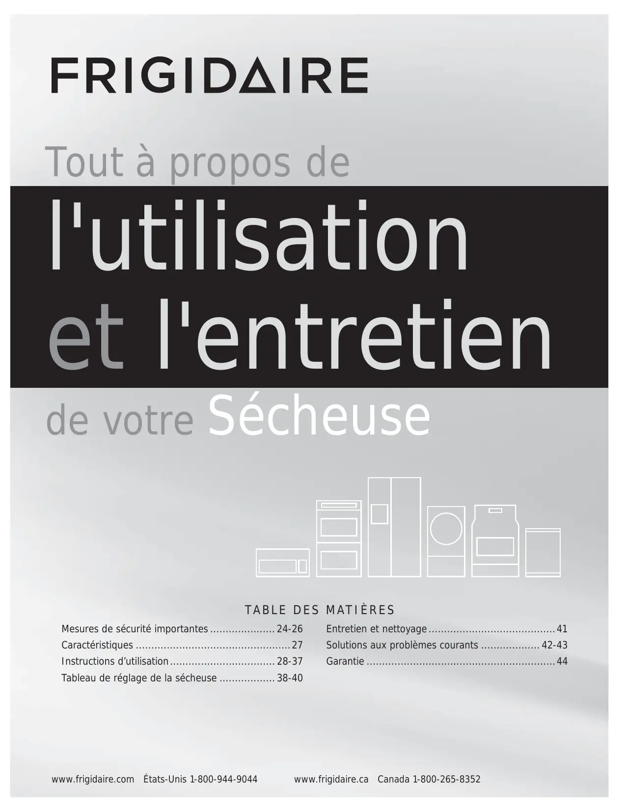 - Tableau de réglage de la sécheuse -40 www.frigidaire.com États-Unis 1-800-944-9044 www.frigidaire.ca Canada 1-800-265-8352 p. 38