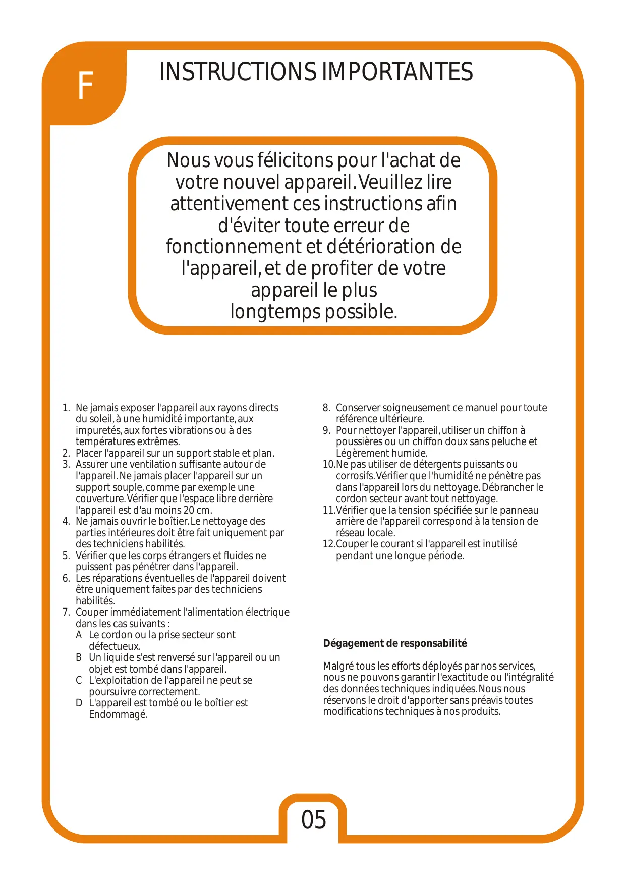Nous vous félicitons pour l'achat de votre nouvel appareil. Veuillez lire attentivement ces instructions afin d'éviter toute erreur de fonctionnement et détérioration de l'appareil, et de profiter de votre appareil le plus longtemps possible.