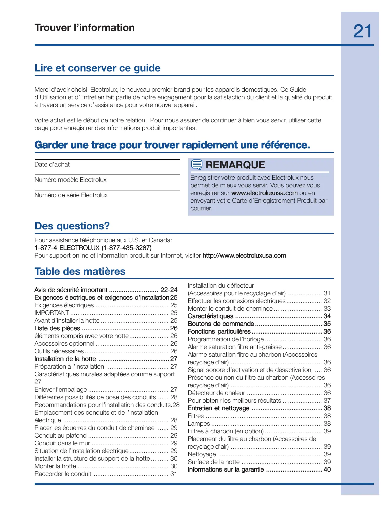Pour un support en ligne et des informations produit sur Internet, visitez http://www.electroluxusa.com